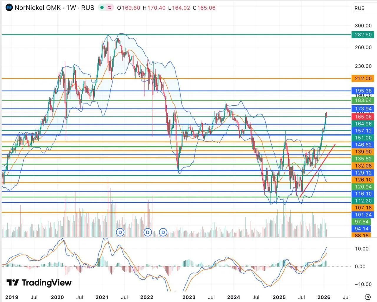 📊 С технической точки зрения бумаги Норникеля в 2026 году развивают начатый еще летом 2025 года восходящий тренд, в рамках которого все ближе подходят к пику всего 2023 года 183,36 руб. При стабилизации выше указанной отметки следующими целями котировок станут уровни 2022 года с перспективой пробоя 200 руб. Среднесрочные сигналы не исключают развития роста акций, в то время как краткосрочные в виде «медвежьей» дивергенции с гистограммой MACD на дневном графике предупреждают о возможной коррекции бумаг с целевыми уровнями 156,50 руб и 146,50 руб перед возвращением к повышению.