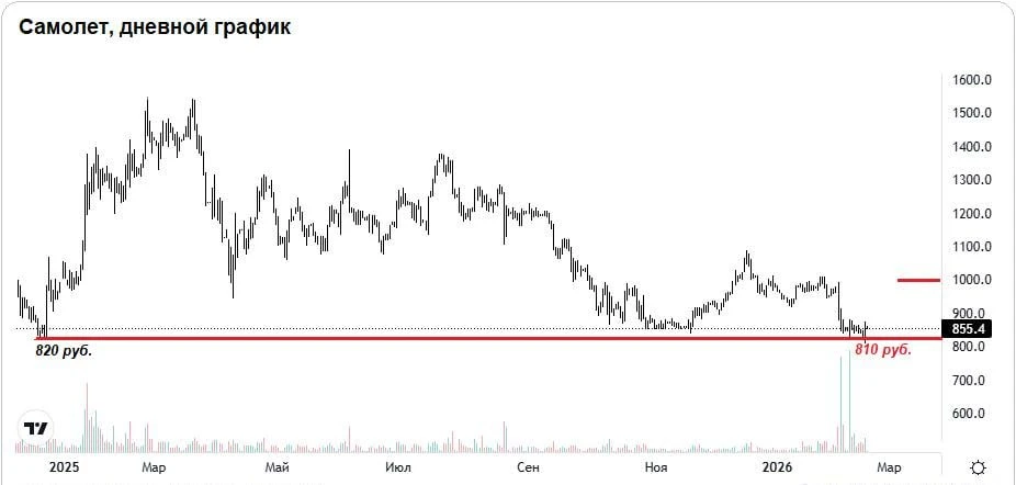 Пробой ценового дна в общем говорит о слабости инструмента и еще может привести к углублению коррекции. После резкого отскока и в случае потери опорных 820–810 руб. ближайшие ориентир-магнит и поддержка будут уже на круглых 800 руб. В моменте нельзя исключать даже локальный прокол психологического уровня с последующей стабилизацией и попыткой разворота. До конца недели сохранится экстремальная волатильность курса.