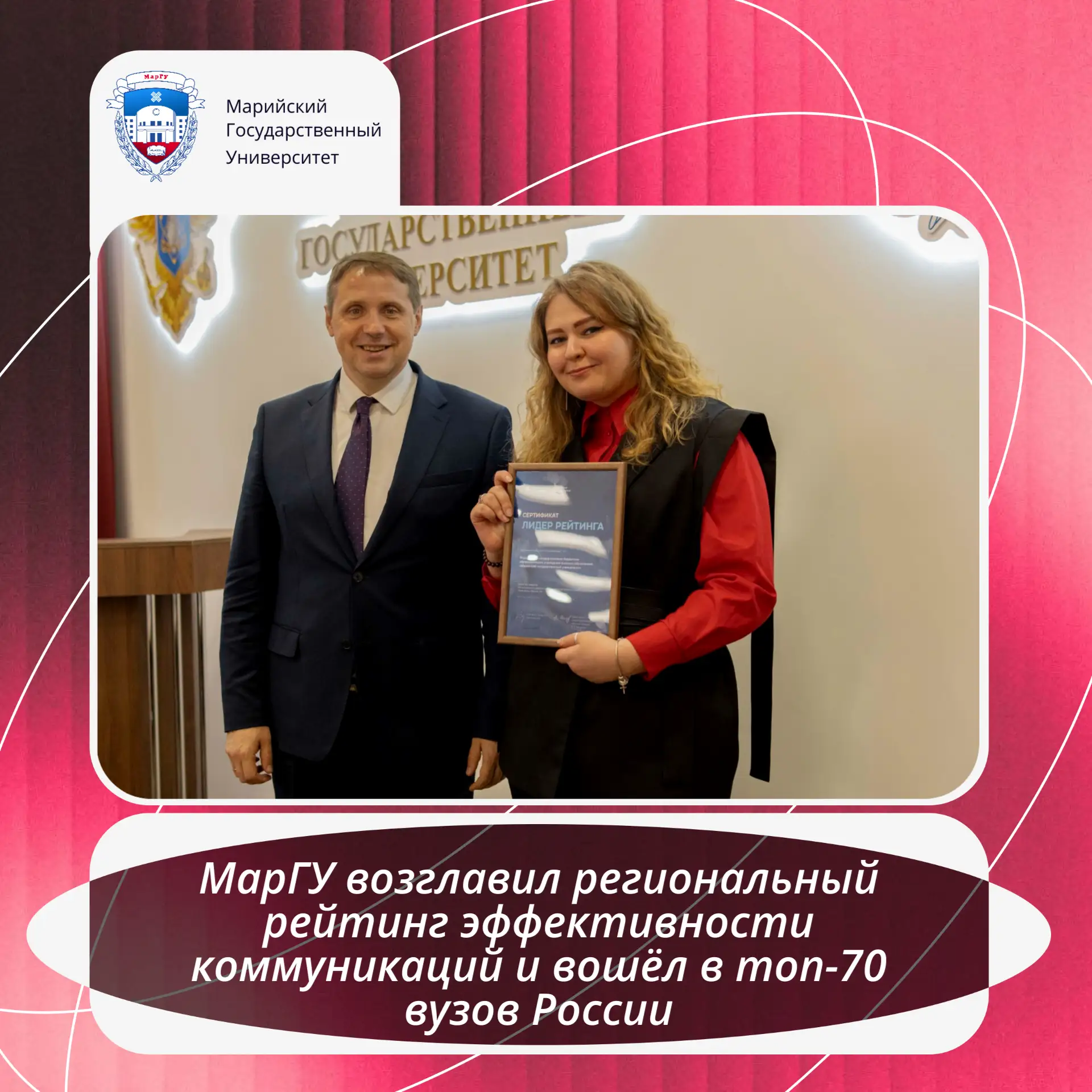🔥 Марийский государственный университет признан лидером интегрального рейтинга эффективности коммуникаций среди вузов Республики Марий Эл в 2025 году. В общероссийском масштабе университет занял 65 место среди образовательных организаций, подведомственных Министерству науки и высшего образования РФ.
