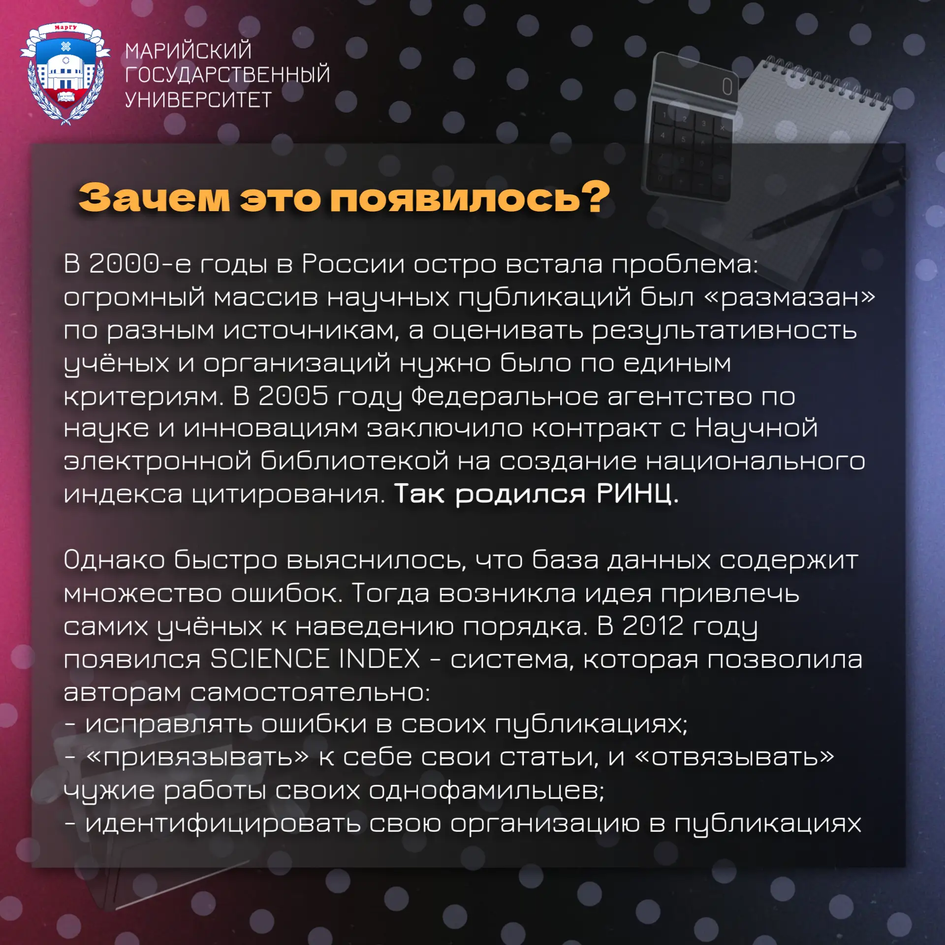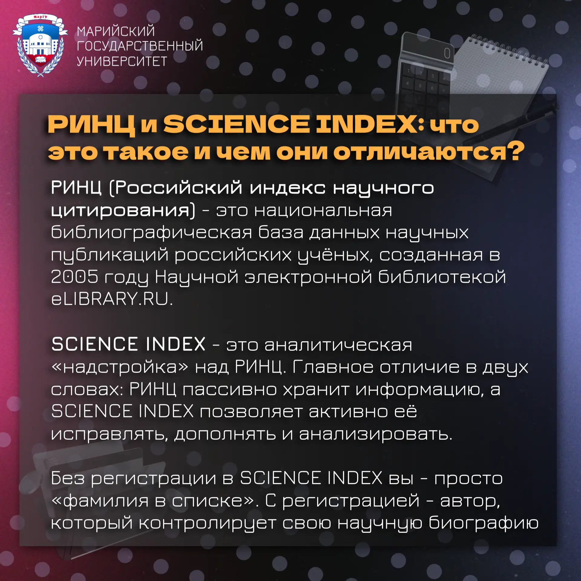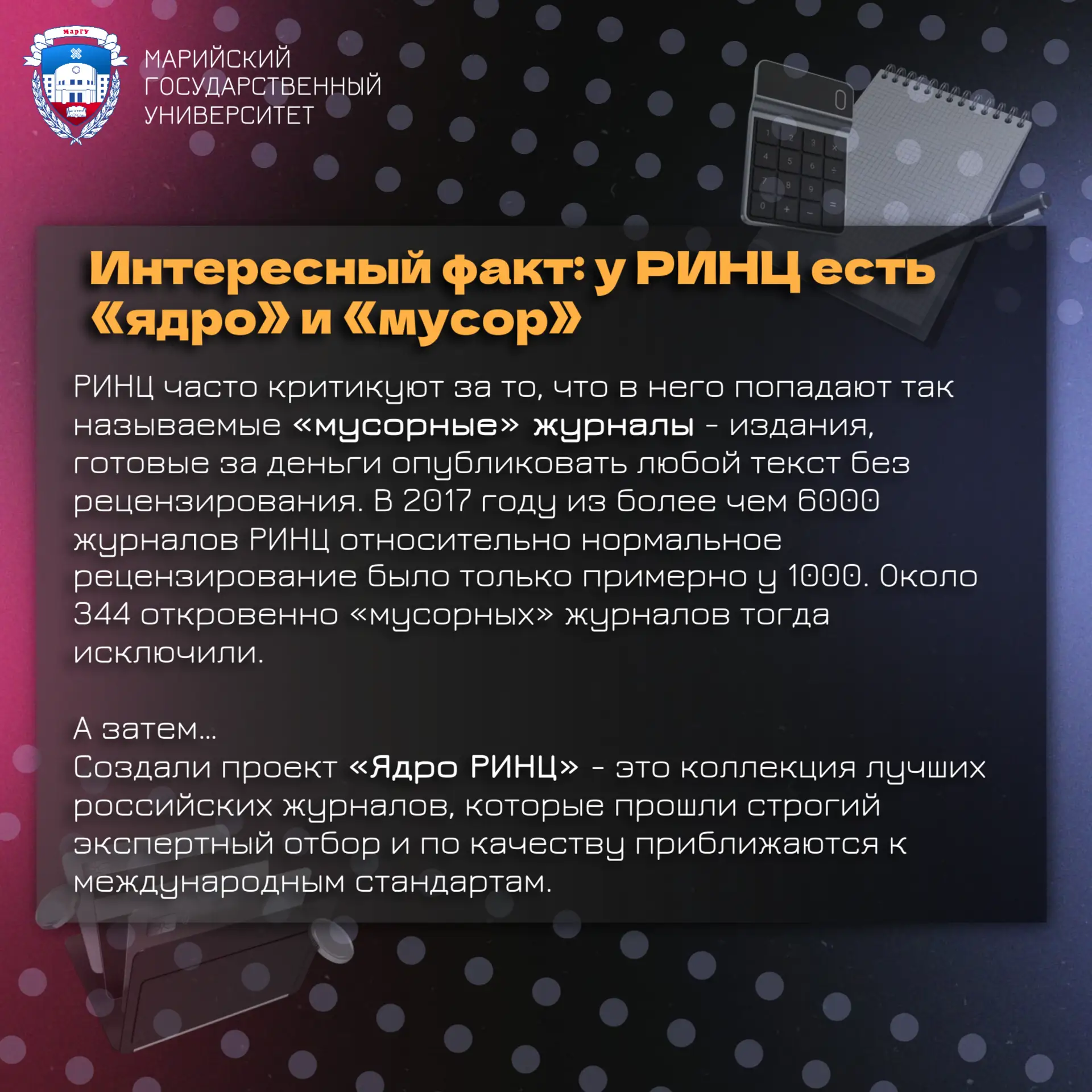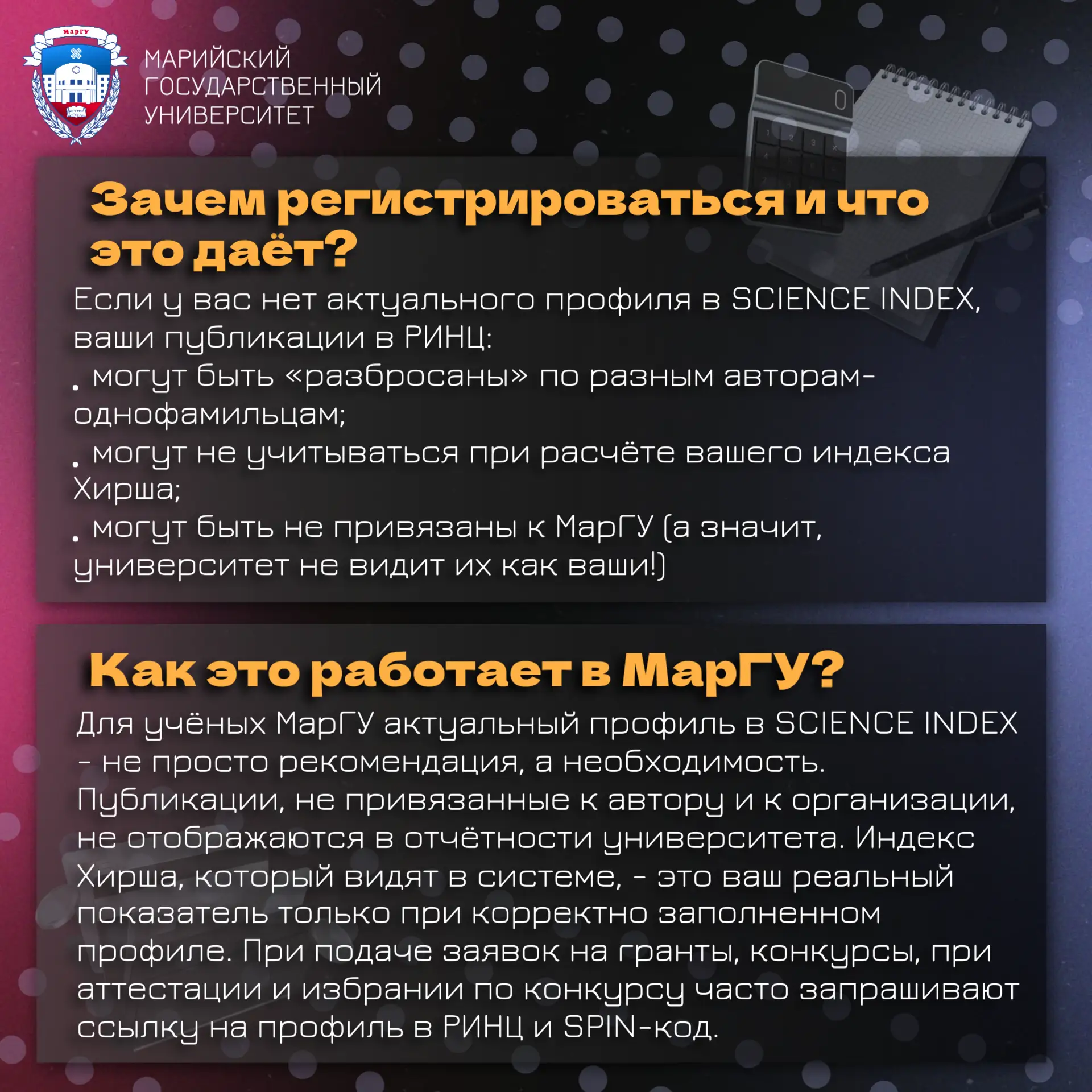 📔 Don’t have a SPIN code yet, or not sure that all your articles are linked to MarSU? Contact the Department of Publication Activity and Intellectual Property — we’ll help you register, check your profile and advise on how to improve your metrics. Even 15 minutes spent “cleaning up” your profile can significantly boost your Hirsch index.
