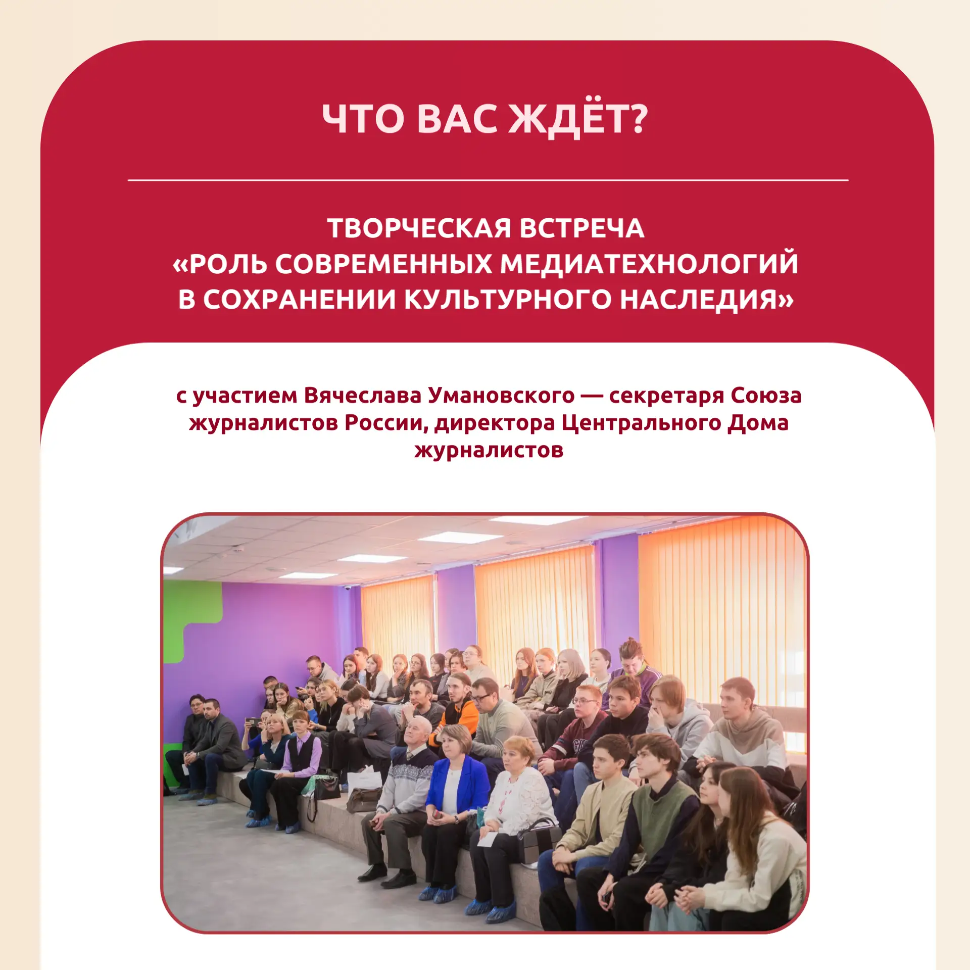 Тема встречи: «Роль современных медиатехнологий в сохранении культурного наследия». Мероприятие объединит журналистов со стажем, в том числе обладателей «Золотого пера», вузовских преподавателей, учащихся медиа-классов – будущих журналистов.