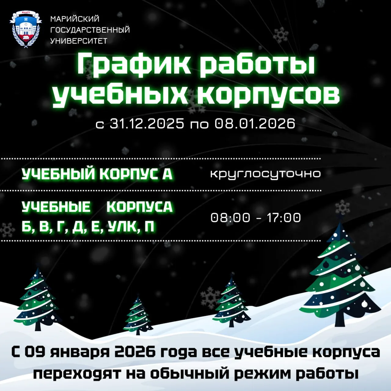 Информируем вас о графике работы нашего университета в период зимних праздников — с 31 декабря 2025 года по 8 января 2026 года. Просим внимательно изучить расписание, чтобы грамотно спланировать свои дела и посещения вуза. С 9 января 2026 года университет возобновляет работу в обычном режиме.