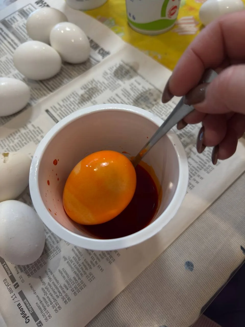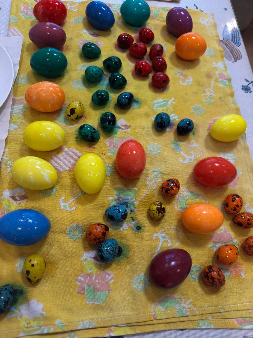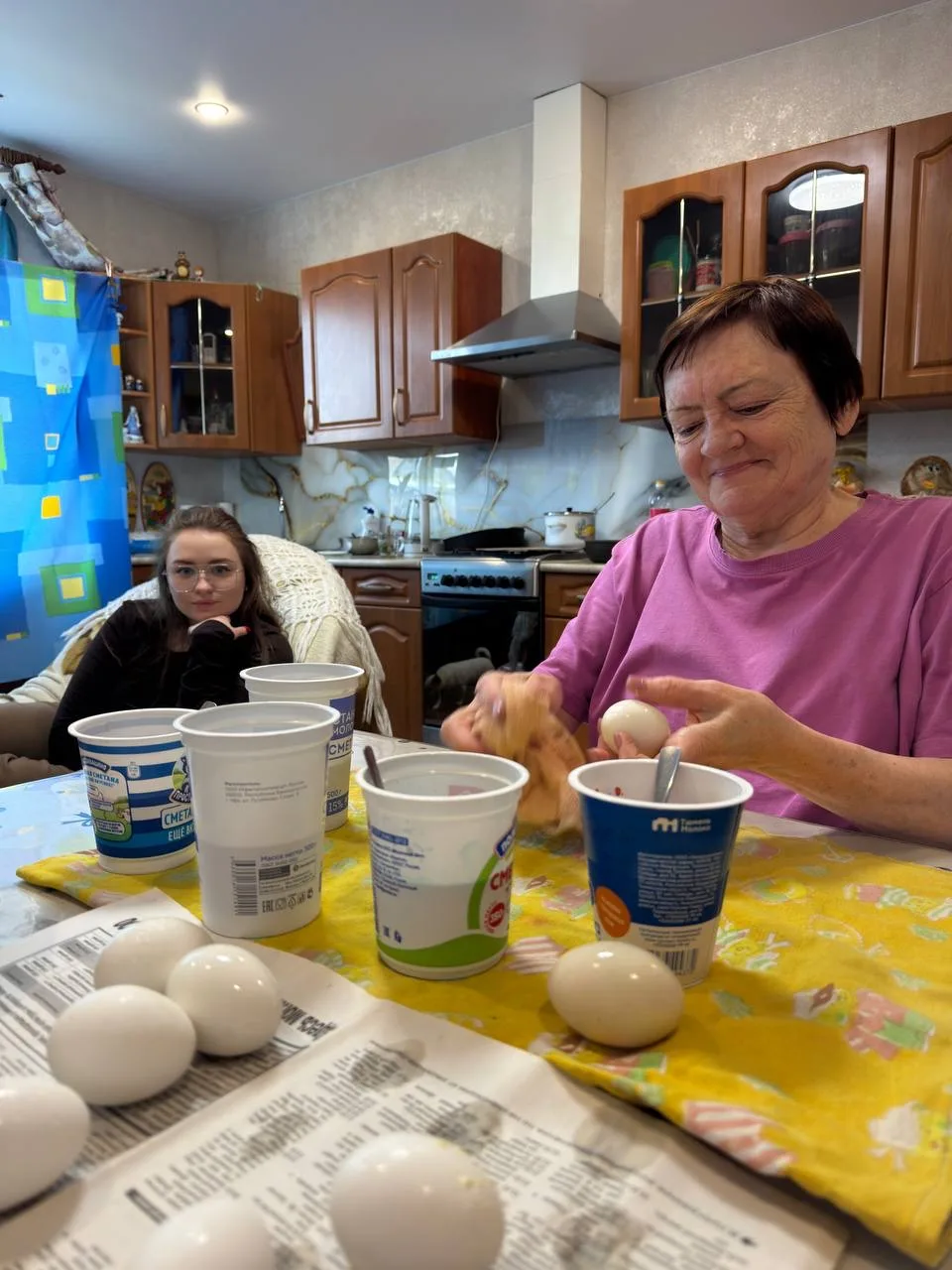 Всем доброго дня. Мы с Екатериной сидим у мамы. Красим яйца, болтаем. Всем привет.
