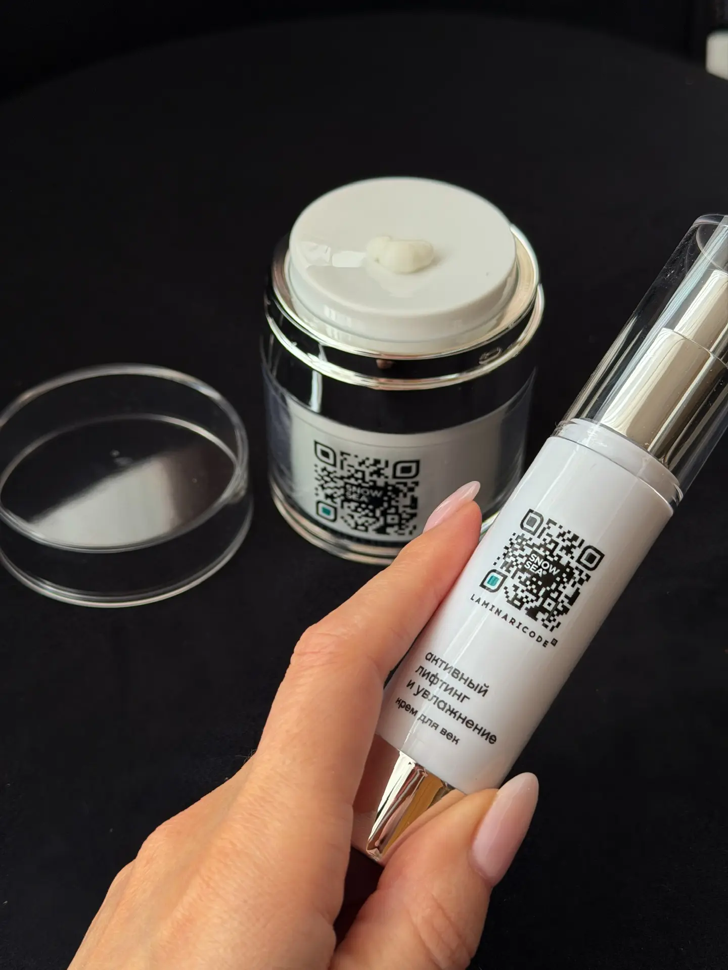💧 Вторая миниатюрная баночка - крем для кожи вокруг глаз. Этот малыш спасает против отёков и морщин.
