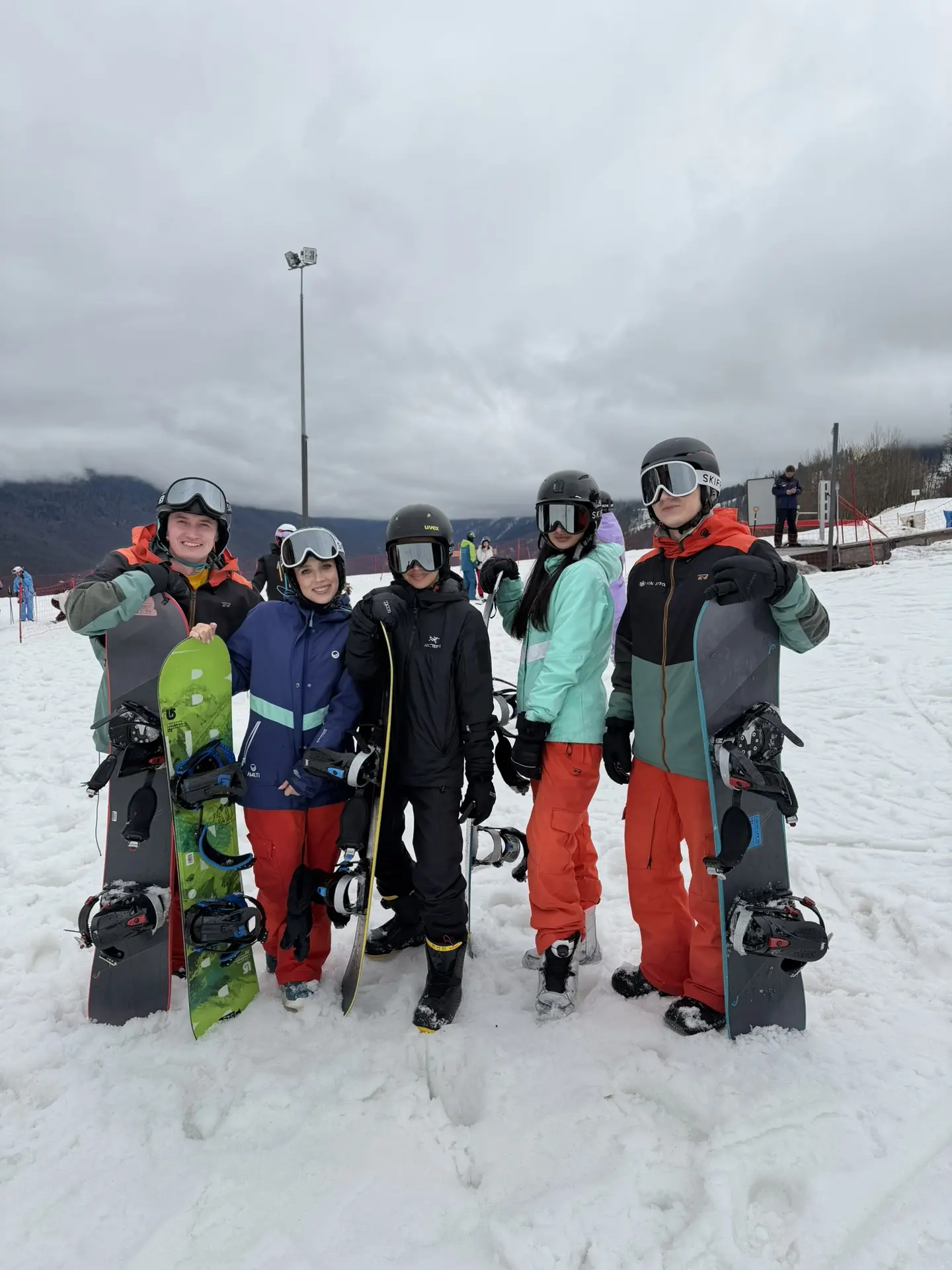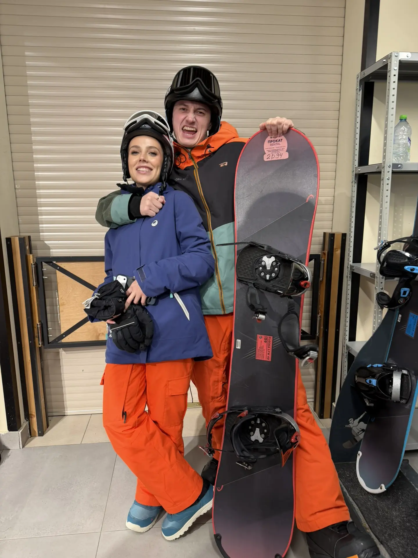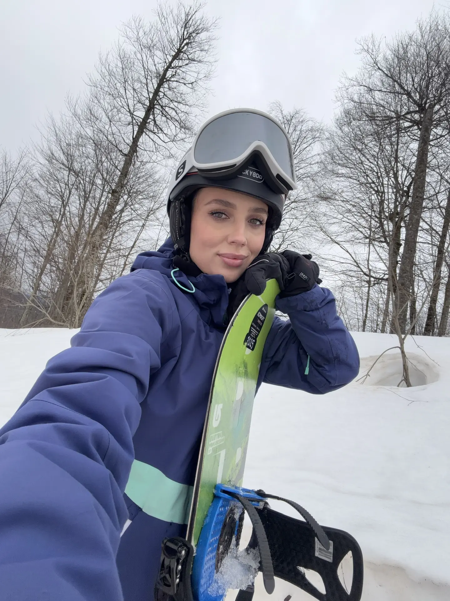 С самого утра мы носимся по склону как маленькие дети. Я вообще в первый раз в жизни встала на сноуборд, опыта - ноль 🤭 Но, представляете, уже с первой попытки встала и поехала! До сих пор в восторге и радуюсь, как ребёнок 🥹