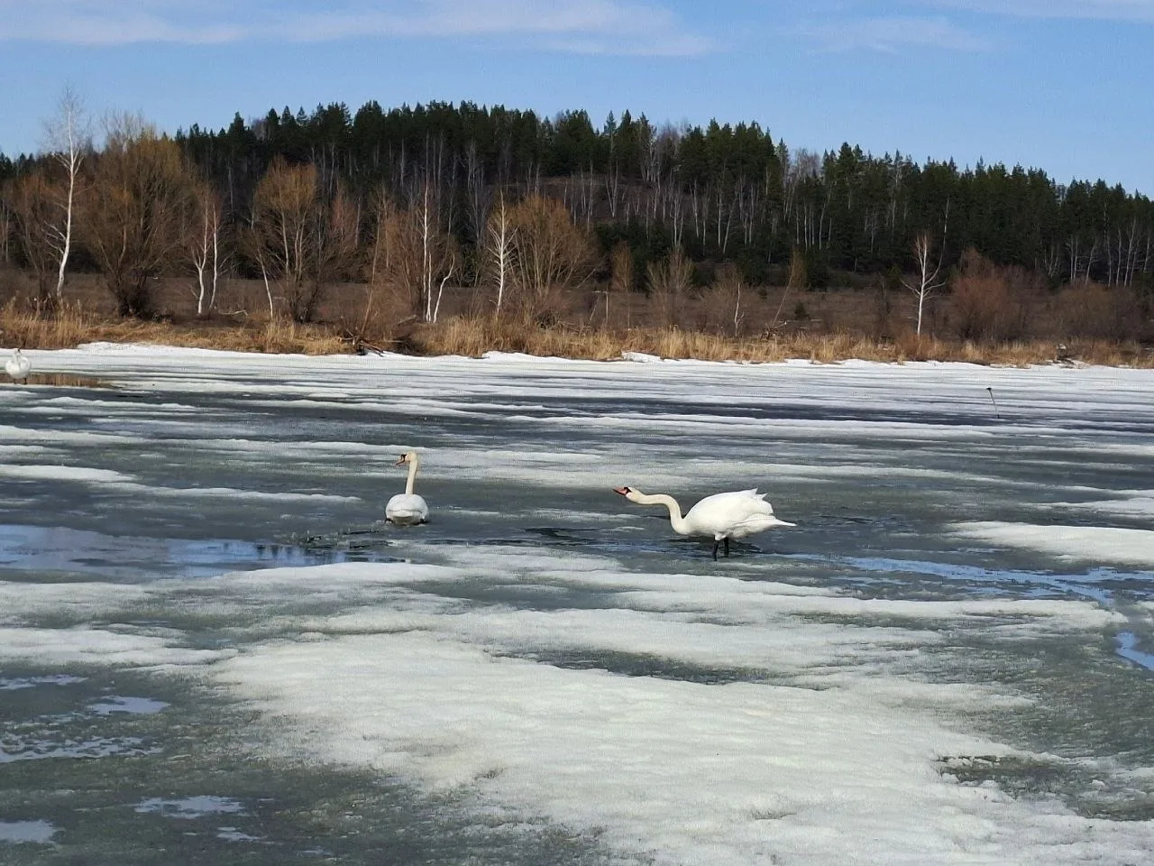Хоть лёд ещё не до конца сошёл с озера, птицы заняли своё почётное место и наслаждаются башкирской природой.