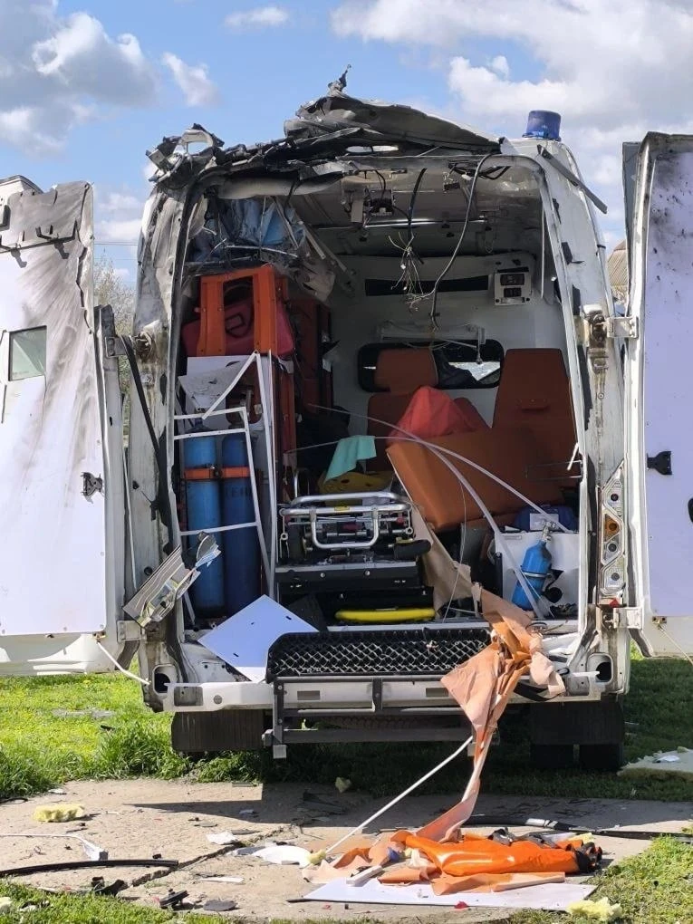 Ещё фото с места обстрела школы в Великой Знаменке: раскуроченная машина скорой, разбитые стены и окна.