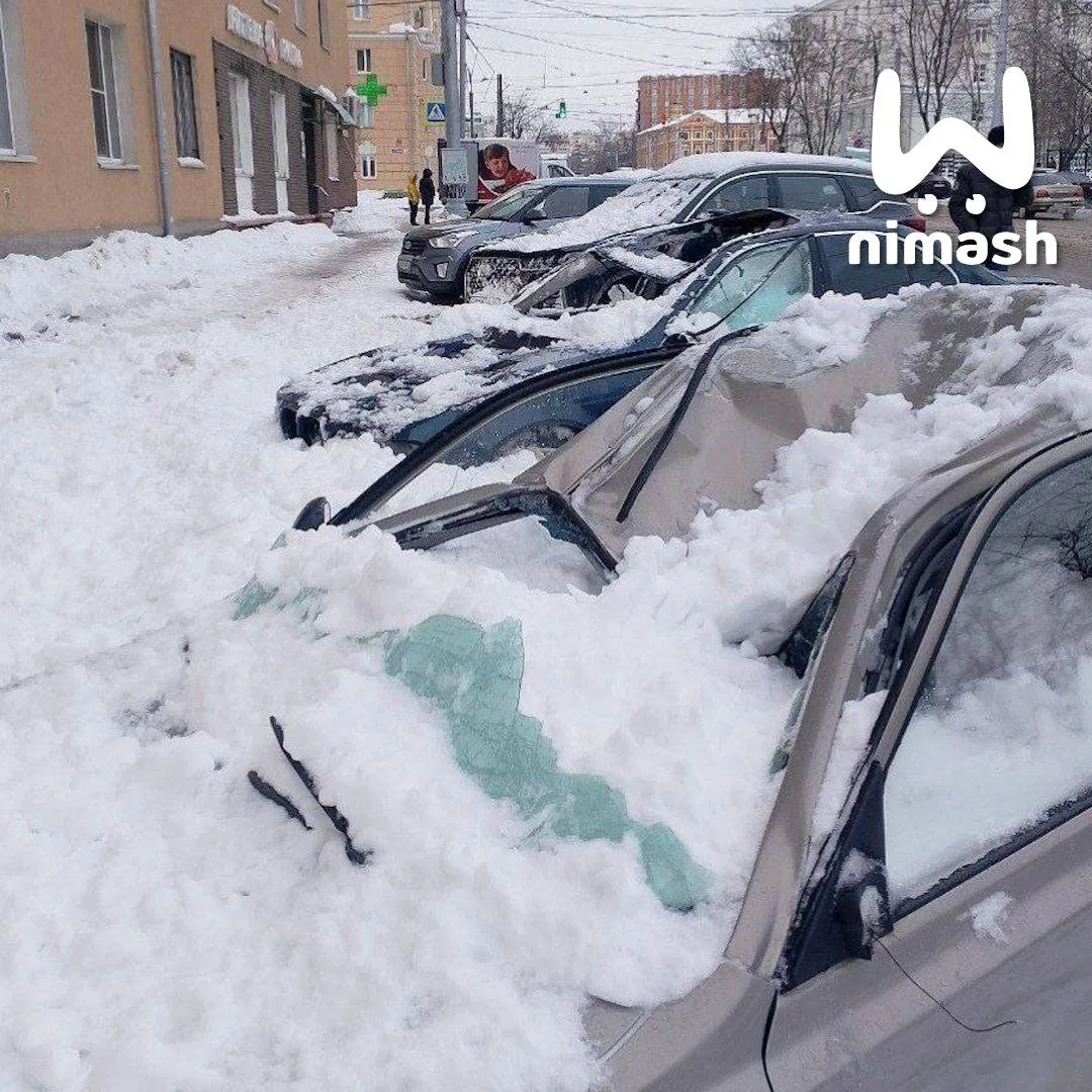 Сугробы с многоэтажки слетели прямиком на припаркованные рядом машины.