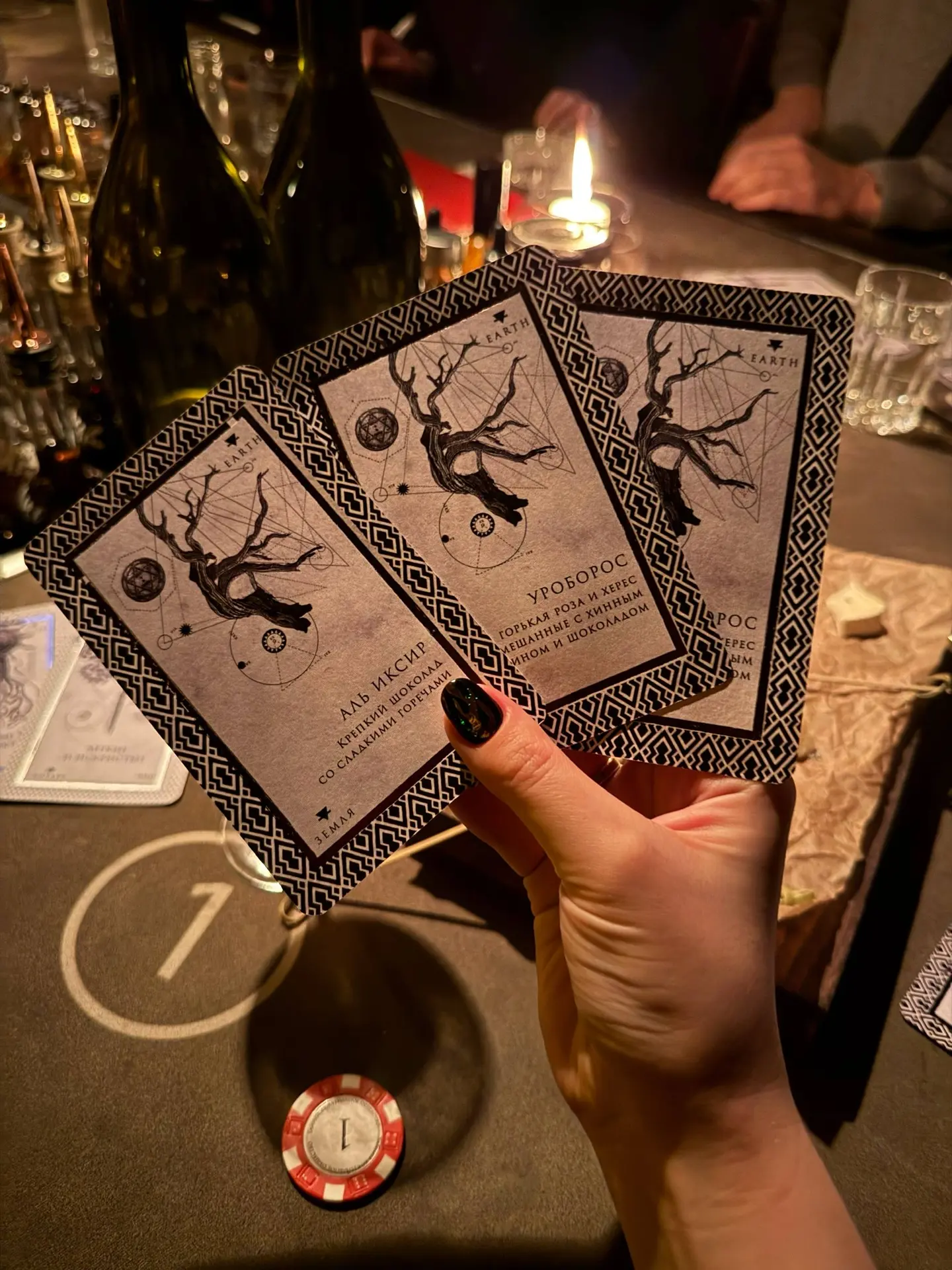 С помощью карт нужно выбрать один из 4 уровней крепости коктейлей (по 950₽ и 990₽ за шт.), в каждой категории есть по несколько разных вариантов. Также можно попросить смешать коктейль по своему вкусу. У меня, например, уже давно в фаворитах свежий коктейль Lilith (950₽) с можжевельником и цитрусом, он стабильно хорош 🔥
