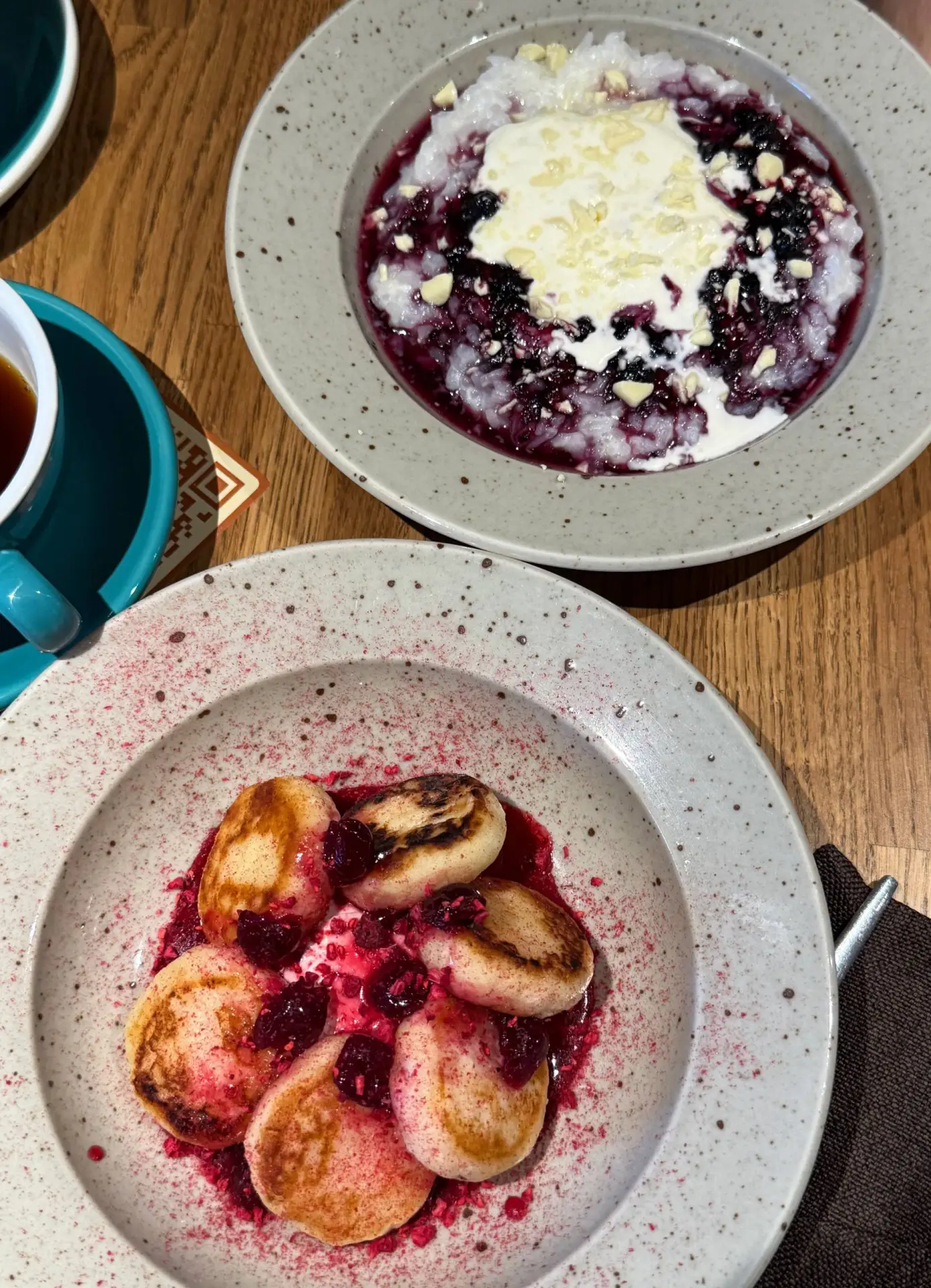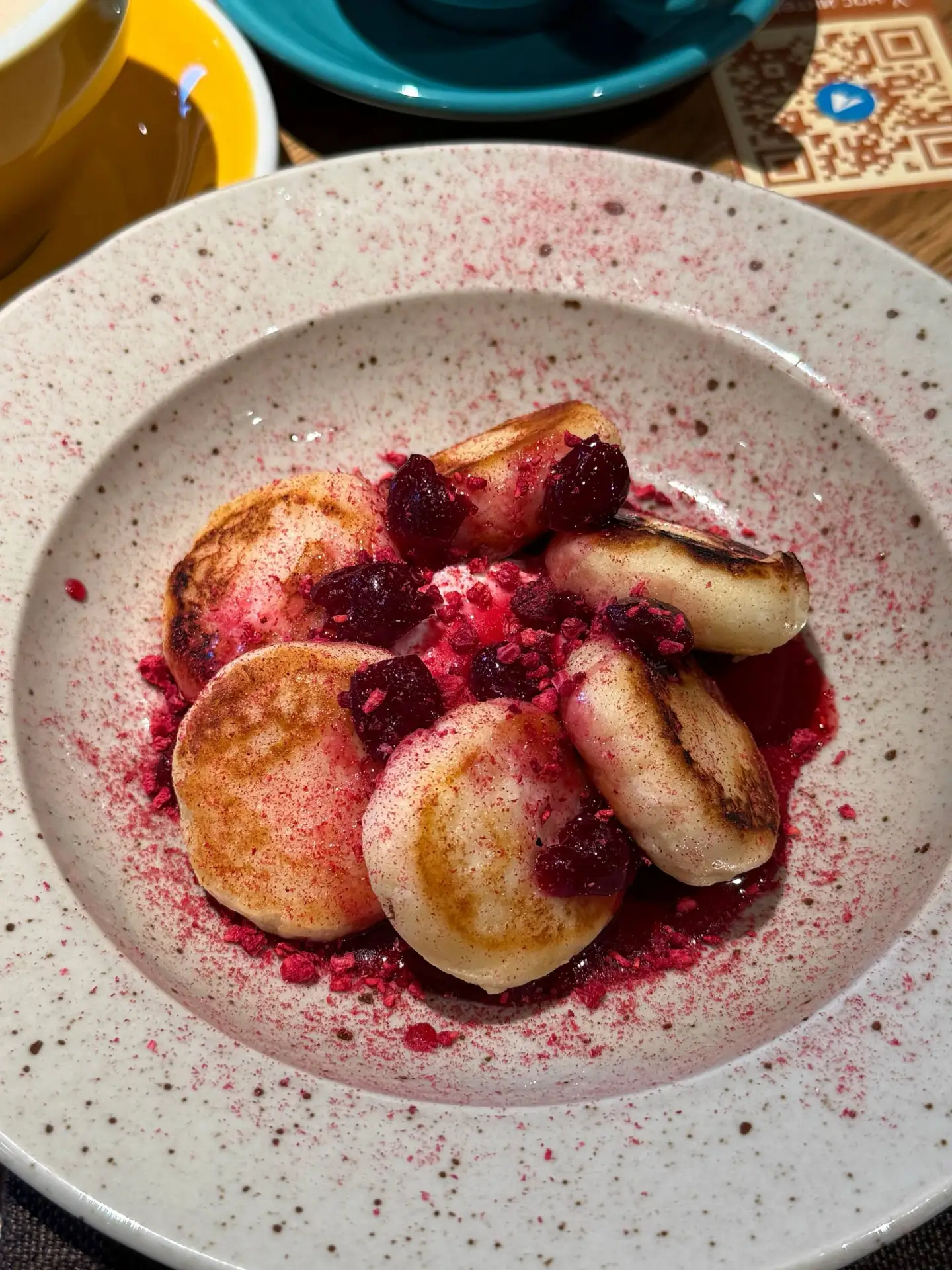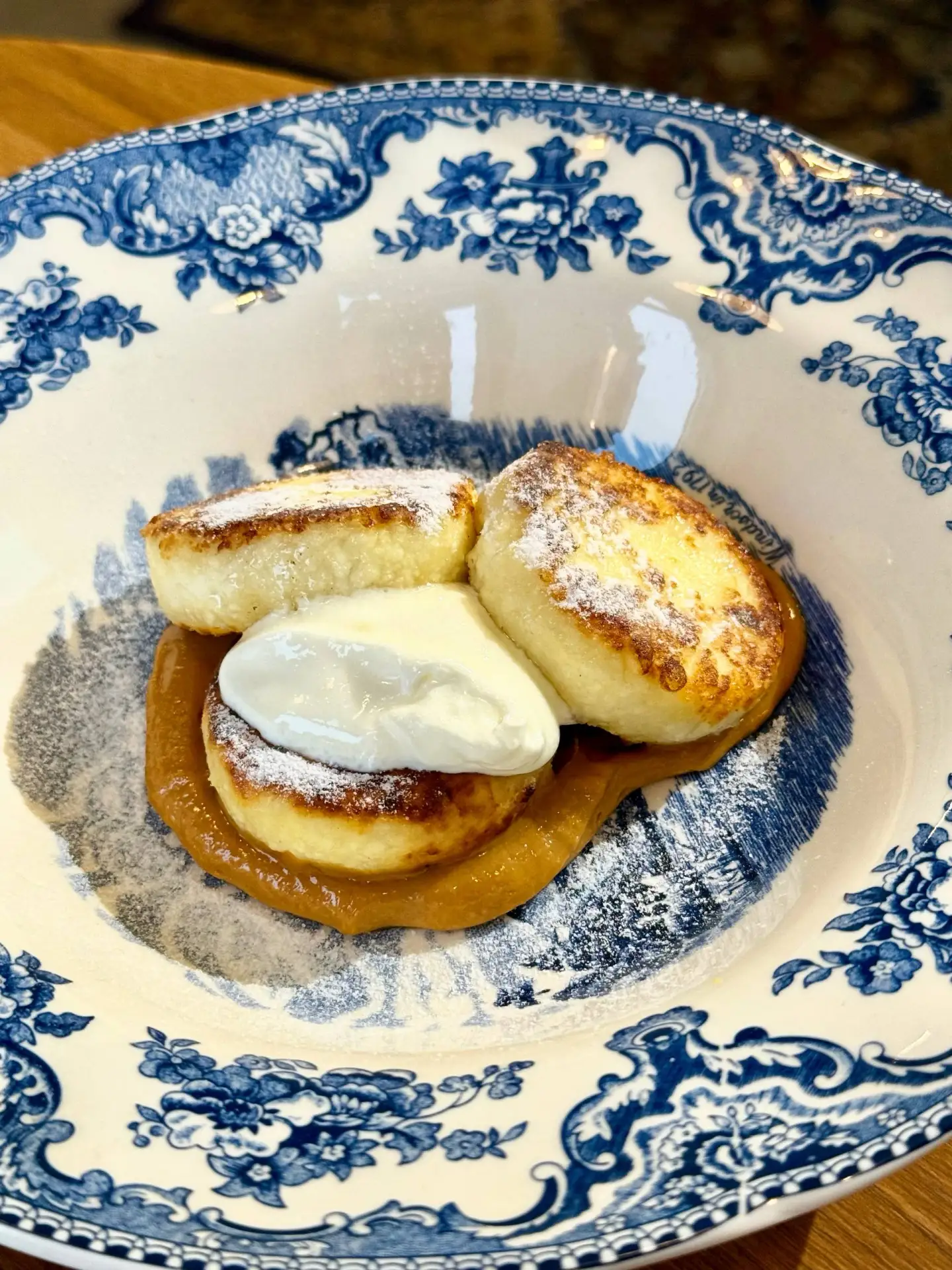 🍴 Сырники со сметаной и муссом из варёной сгущёнки (390₽) - отличные, на вкус совсем как домашние, ооочень творожные.