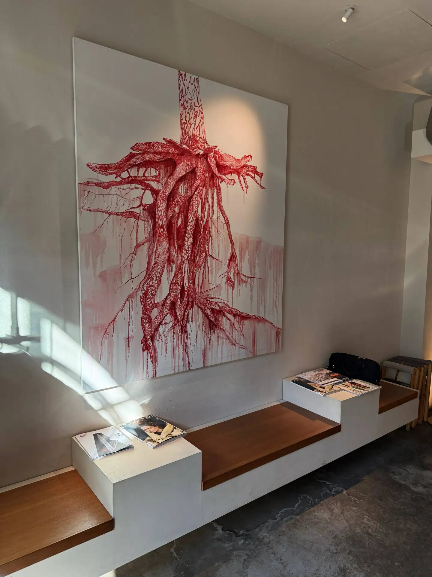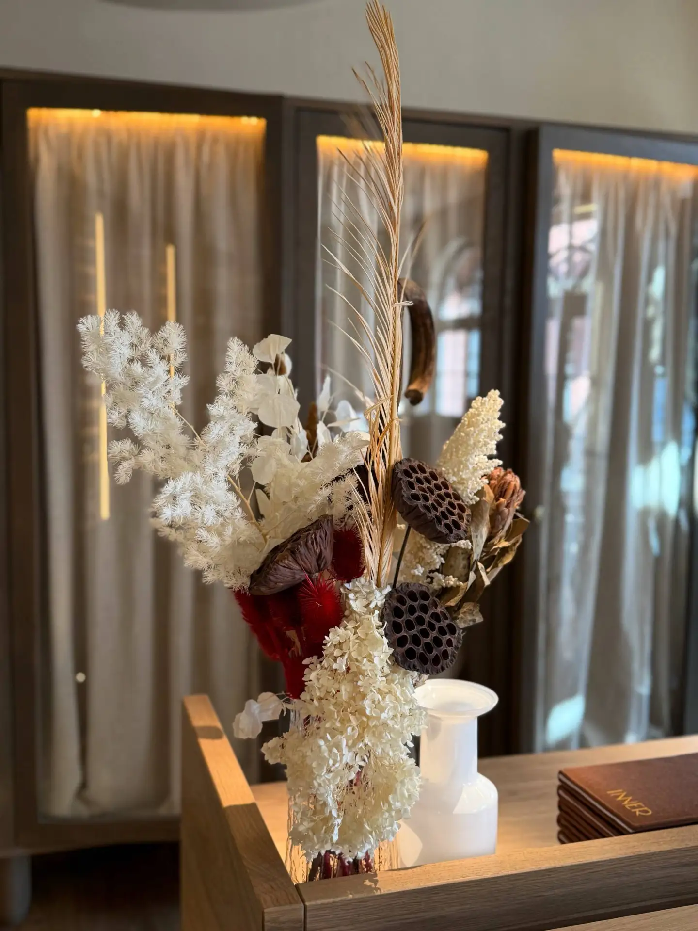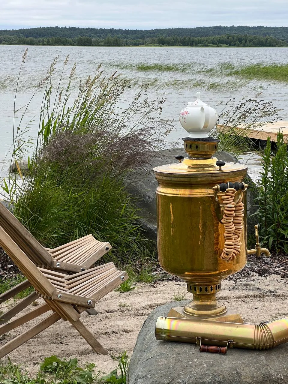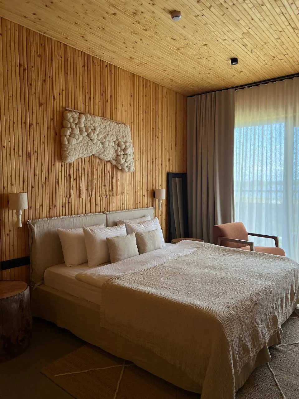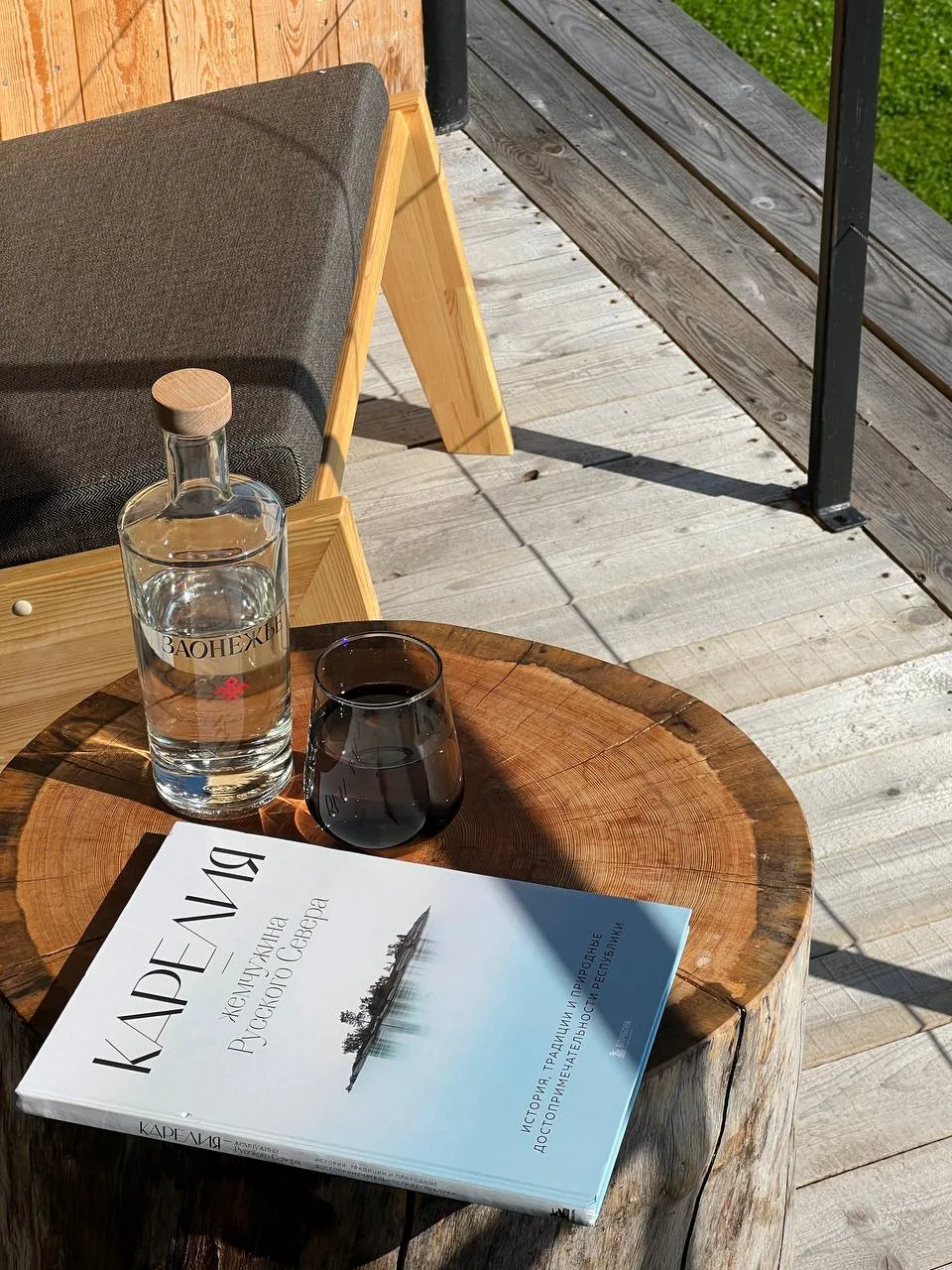 Сам отель находится на краю колоритной деревни Кажма. Это островок цивилизации, где можно отдохнуть, не жертвуя городским комфортом: тут есть 13 видовых номеров и 4 гостевых дома с дровяными каминами, ресторан, событийный зал с видом на озеро, пирс и тропы. В интерьере много берёзы и сухостойной карельской сосны Кело, используются узоры заонежской вышивки и карельские руны 🪵