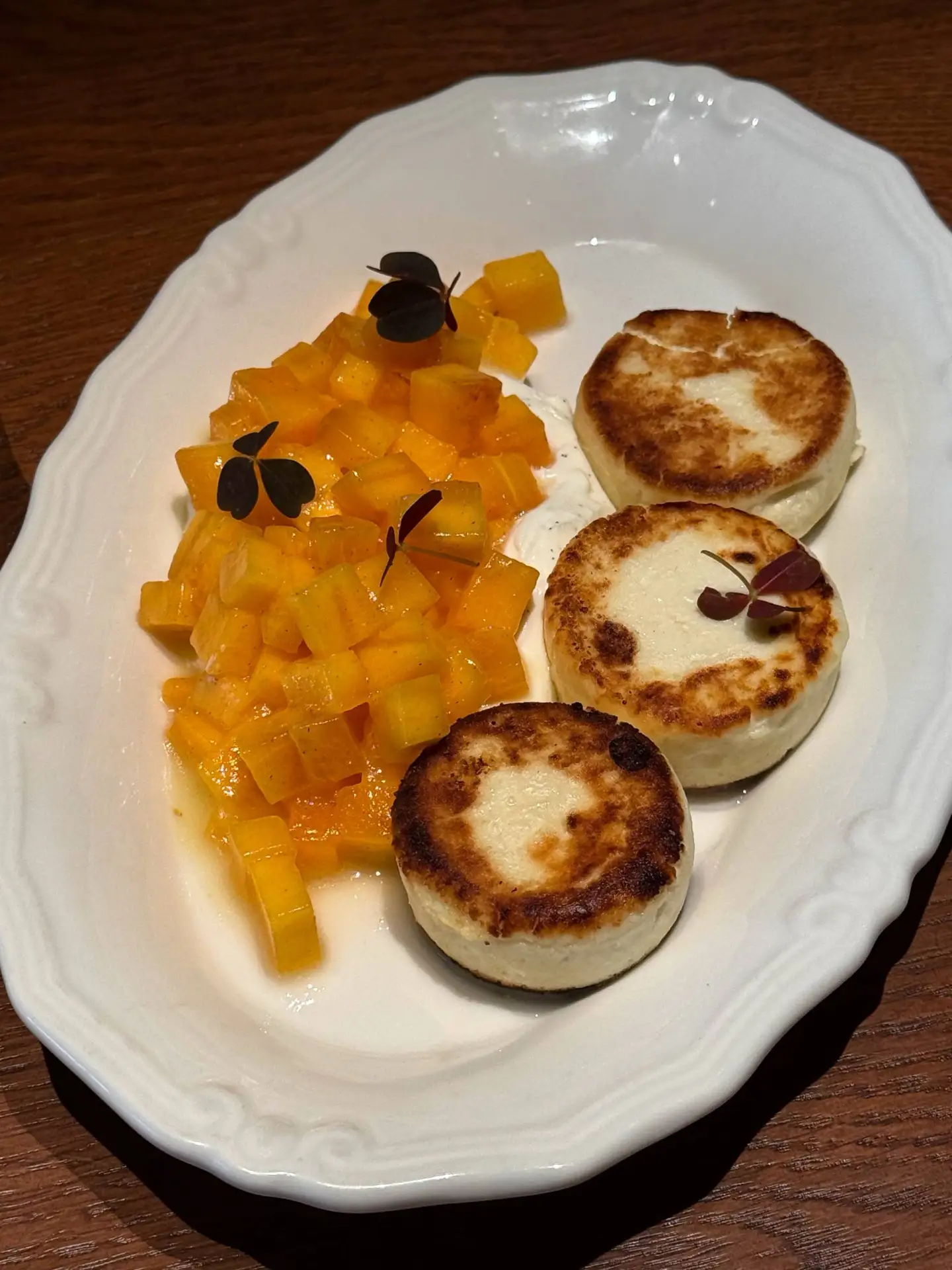 🍽 Сырники с хурмой и ванильным кремом (690₽) - сами сырники хороши, отличный баланс творога и муки, крем лёгкий и в меру сладкий, много кусочков спелой хурмы.