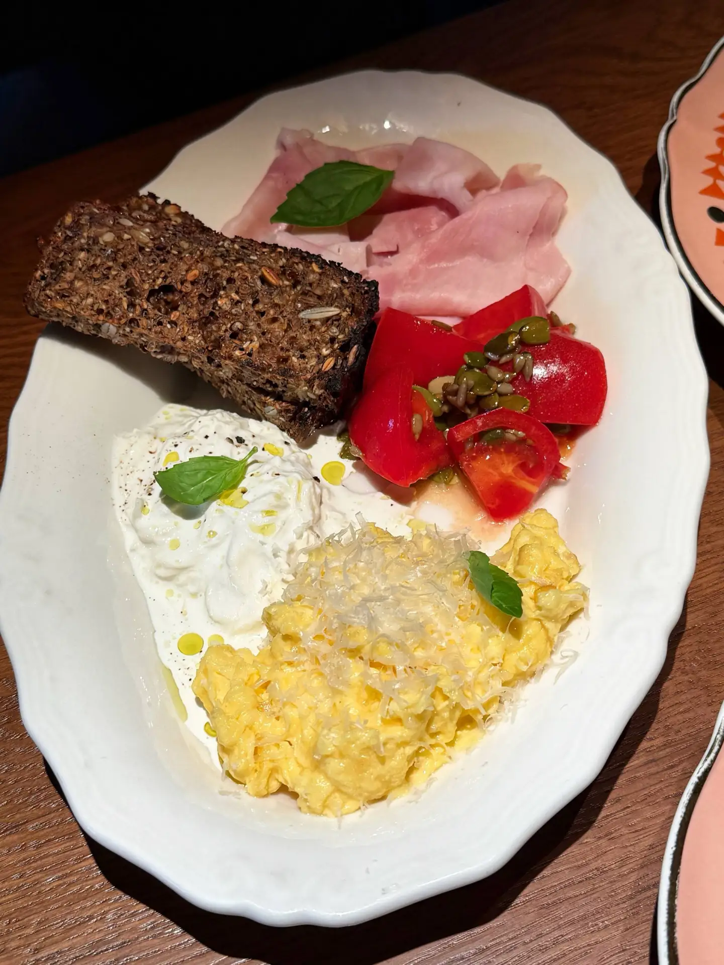 🍳 Скрембл с прошутто, томатами и страчателлой (990₽) - один из вариантов завтраков-конструкторов из яиц, сытная классика, подача с зерновым хлебом.