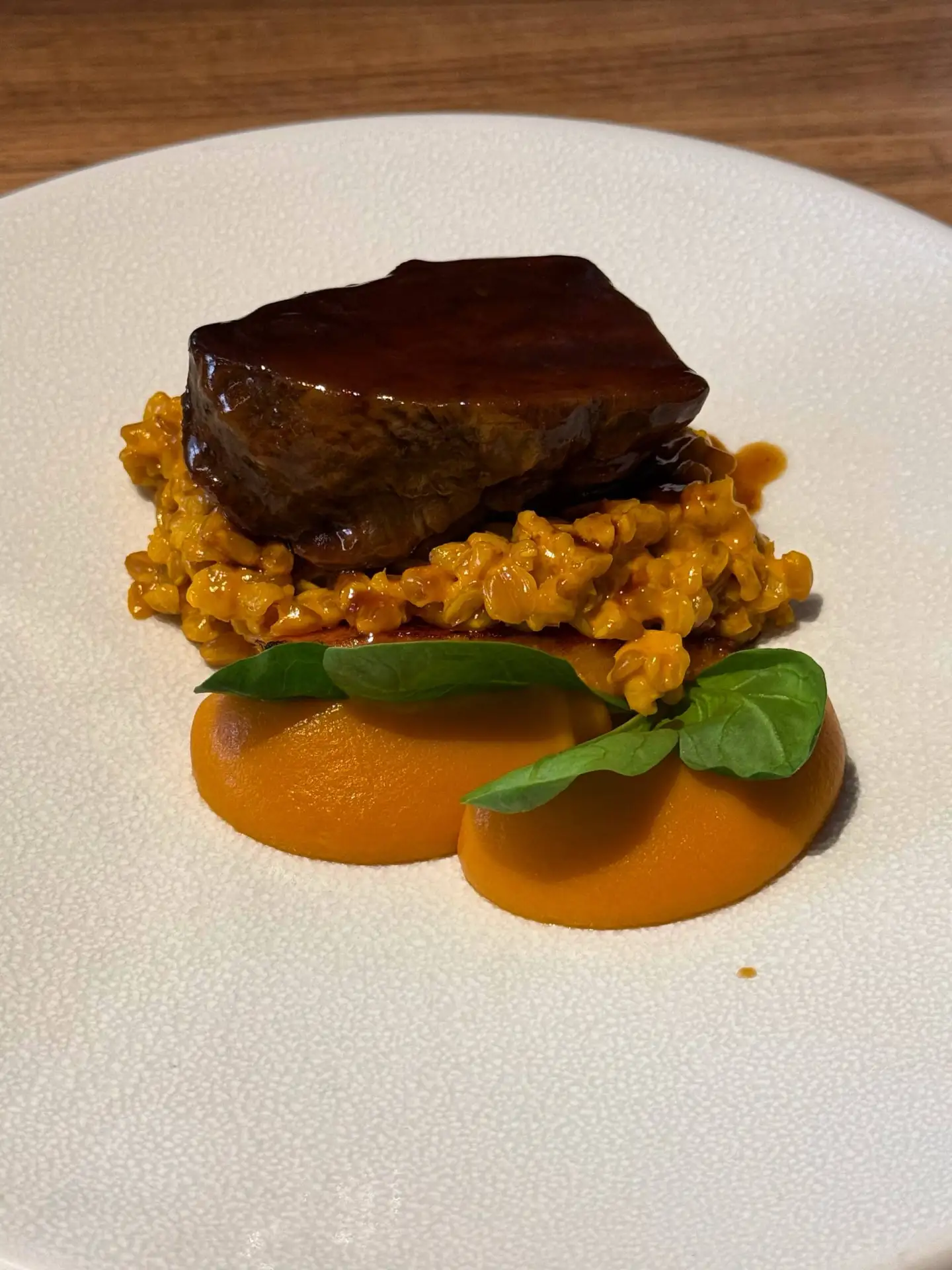 🍮 Баскский шоколадный чизкейк с оливковым маслом и трюфельной солью (490₽) - обычно спокойно отношусь к шоколадным десертам, но этот просто ВАУ, не слишком сладко, очень крутой и неожиданный микс вкусов.