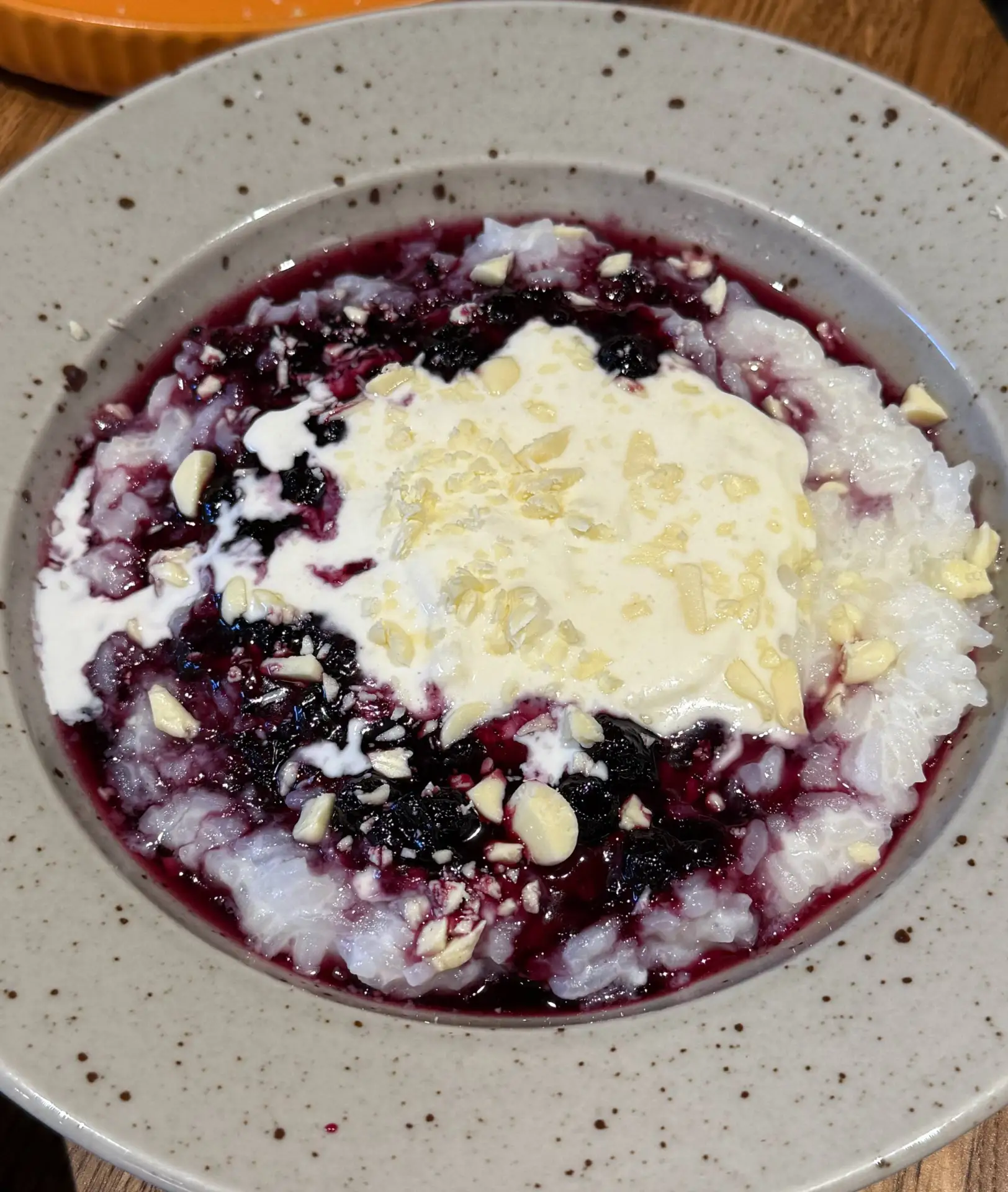 🥣 Рисовая каша со страчателлой и черничным вареньем (570₽) - необычное классное сочетание, страчателла даёт дополнительную сливочность, черника - лёгкую кислинку, а сверху всё посыпано стружкой белого шоколада, рекомендую!