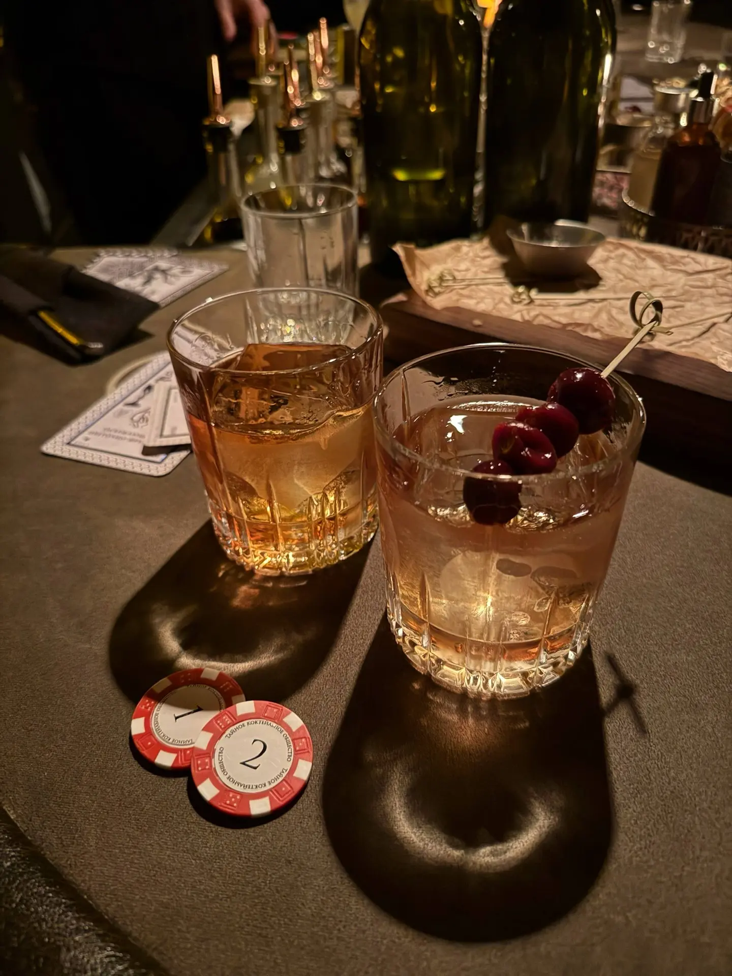Концепция бара отсылает к подпольным заведениям периода «сухого закона» в Российской Империи, где не только пили, вопреки запрету, но и вели игру в покер. Сейчас всё легально и безобидно, но тематически соответственно стилизованы столы, номерки-фишки и даже коктейльное меню в виде карточной колоды 🃏