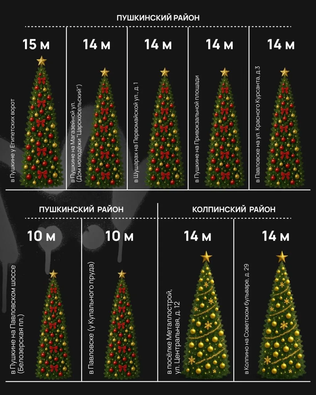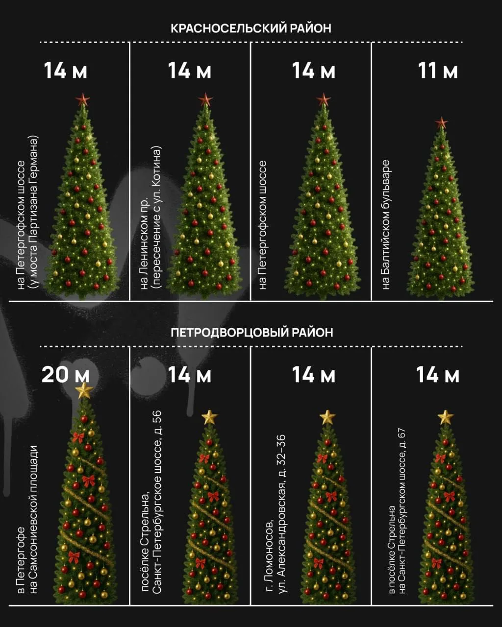 На любой вкус и размер — чекайте, где какая стоит. Ищите самый длинный праздничный ствол в своём районе. С наступающим!