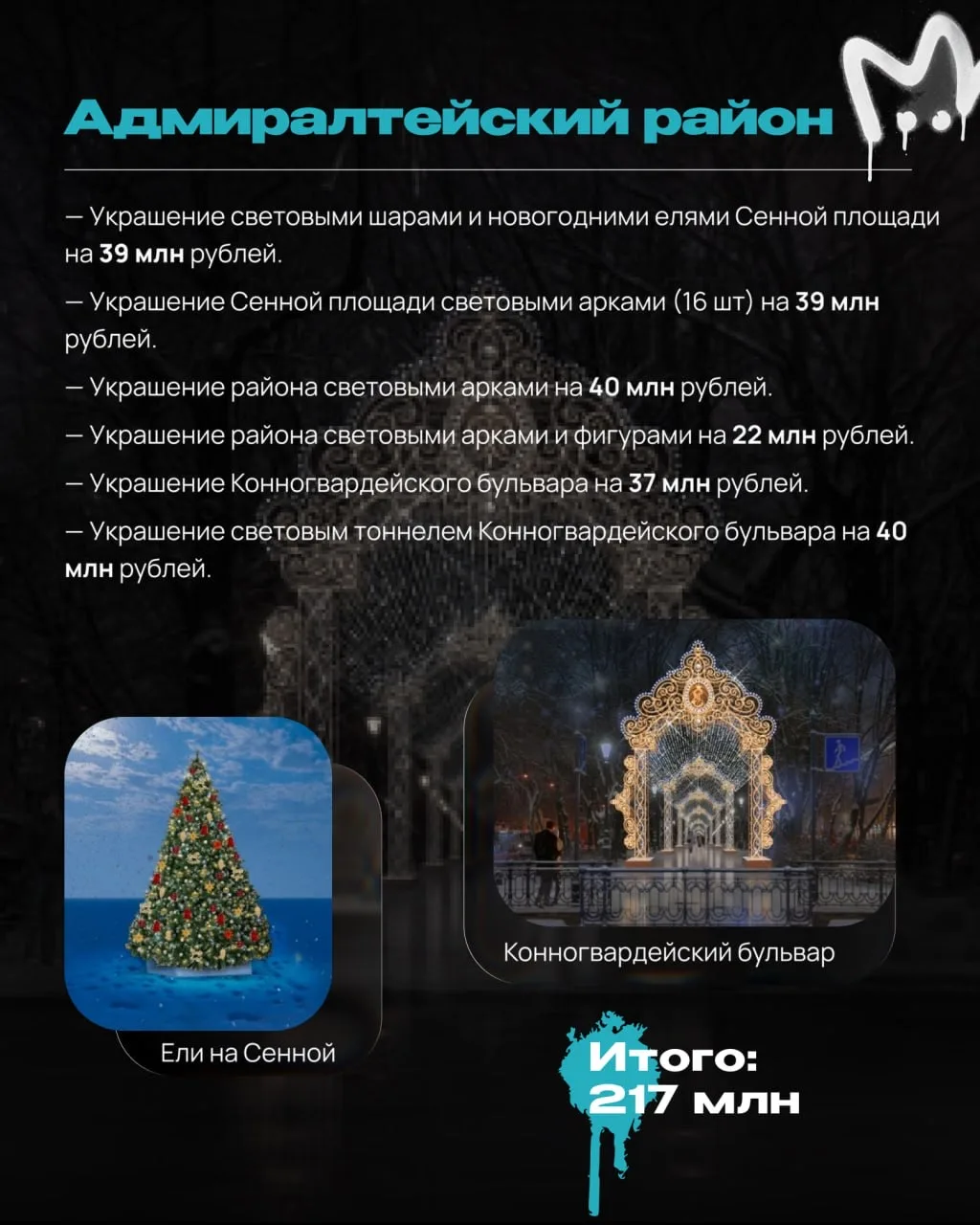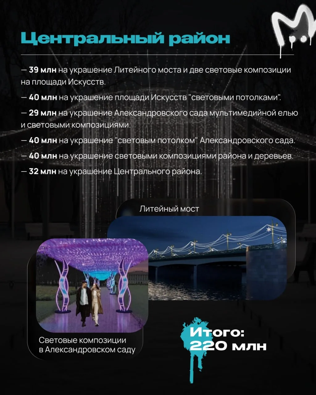 Максимально сияющие на этих праздниках — Конногвардейский бульвар и Сенная площадь: световые туннели, арки, композиции и ёлки по 80 лямов рублей на локацию. Чуть меньше досталось Александровскому парку — 70 лямов на ламповый потолок, фигурки и хвойные. Где ещё засядут красоты предстоящих каникул — смотрите в наших карточках.