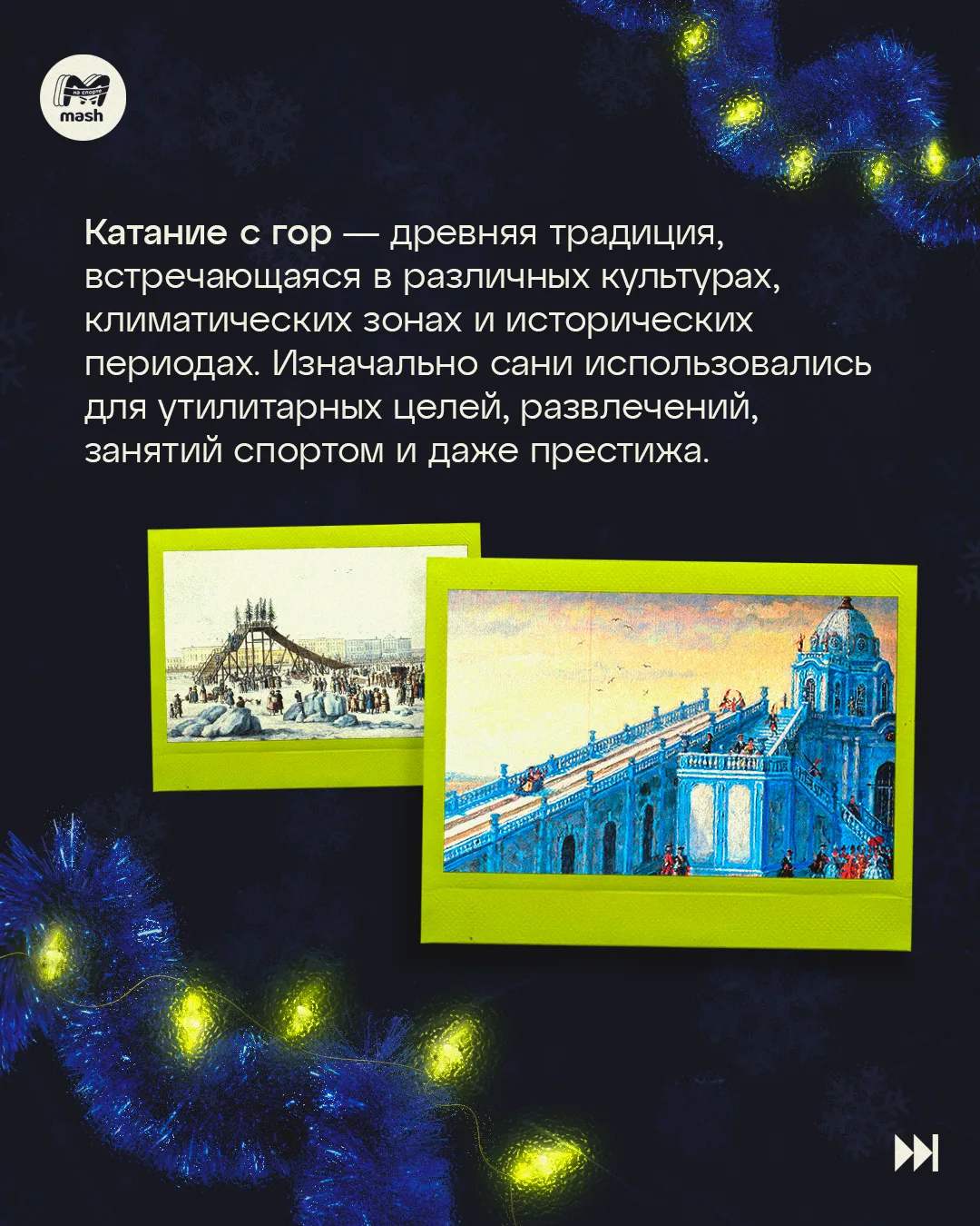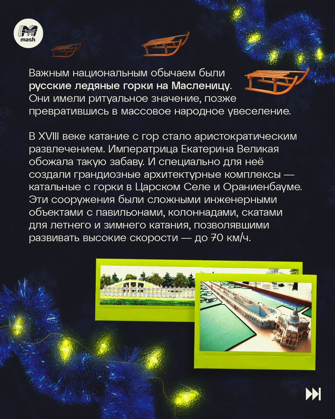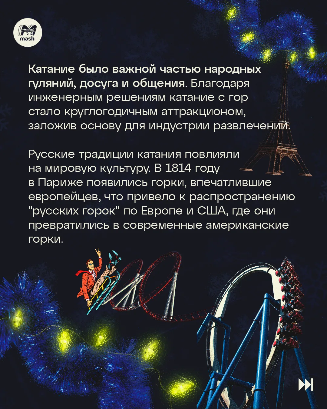 Когда любовь к покатушкам с горки зародилась в нашей стране? Как она повлияла на создание самого страшного аттракциона — американских горок? И что будет на Mash на горке? Рассказываем в карточках.