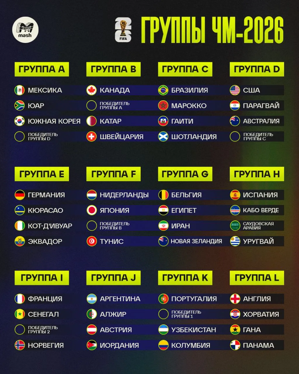 Жеребьевка ЧМ по футболу состоялась. Турнир пройдёт в США, Канаде и Мексике летом 2026-го. Зрители увидят топ-матчи группового этапа Хорватия — Англия и Испания — Уругвай. Узбекистан попал в "группу смерти", сыграет с Португалией и Колумбией. Все 12 групп — на нашей пикче.