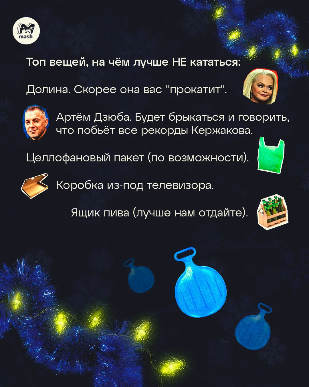 Наш зимний фестиваль тюбингов "Mash на горке" стартует уже на этих выходных 13 и 14 декабря. В субботу и воскресенье собираем всех желающих активно провести время на свежем воздухе, сплотиться и поболеть за самых креативных ребят. Три заводных усача — Влад Антонов, Даня Лядов и Саша Шпак уже разминают свои пуховики, чтобы развлекать вас на протяжении целого дня и провести прямую трансляцию.