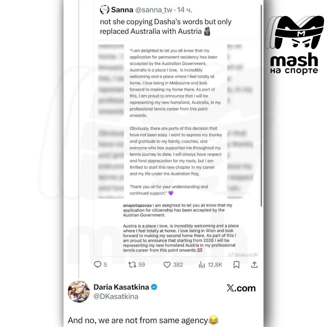 Теннисистка Анастасия Потапова призналась в любви к Австрии. Текстом, который скопировала у Дарьи Касаткиной. Одна экс-россиянка взяла буквы у другой экс-россиянки и лишь заменила Австралию на название страны ЕС. За это была высмеяна в соцсетях.