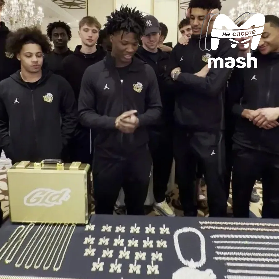 Наглядный пример уровня студенческого спорта в США: игрокам баскетбольной команды "Мичиган вулверинс" подарили золотые цепи с подвеской в виде логотипа клуба, украшенной бриллиантами за $306к или 24 млн рублей.