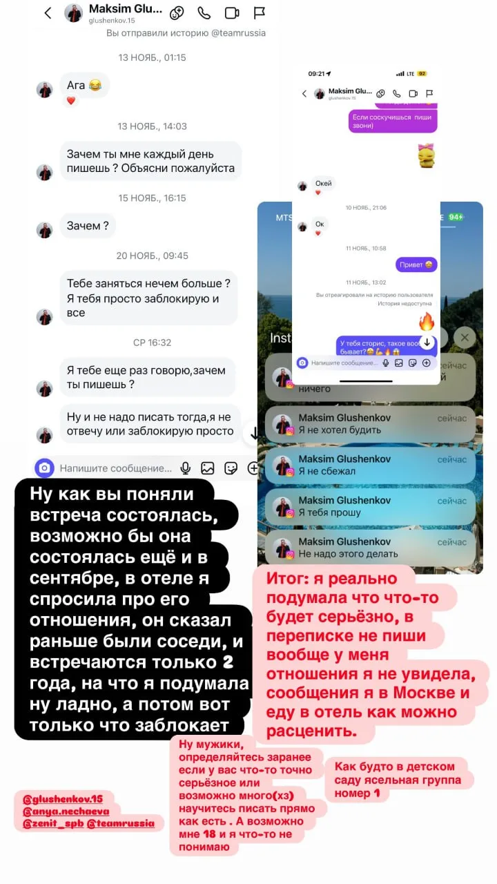 Кира Артамонова заявила, что общалась с футболистом с 2024 года. 9 ноября, после матча с "Крыльями Советов" в Самаре, Глуш прилетел в столицу и написал ей. Неоднозначно приглашал в отель DoubleTree by Hilton Moscow — Marina Hotel, просил нюдсы, а после совместной ночи перестал отвечать.