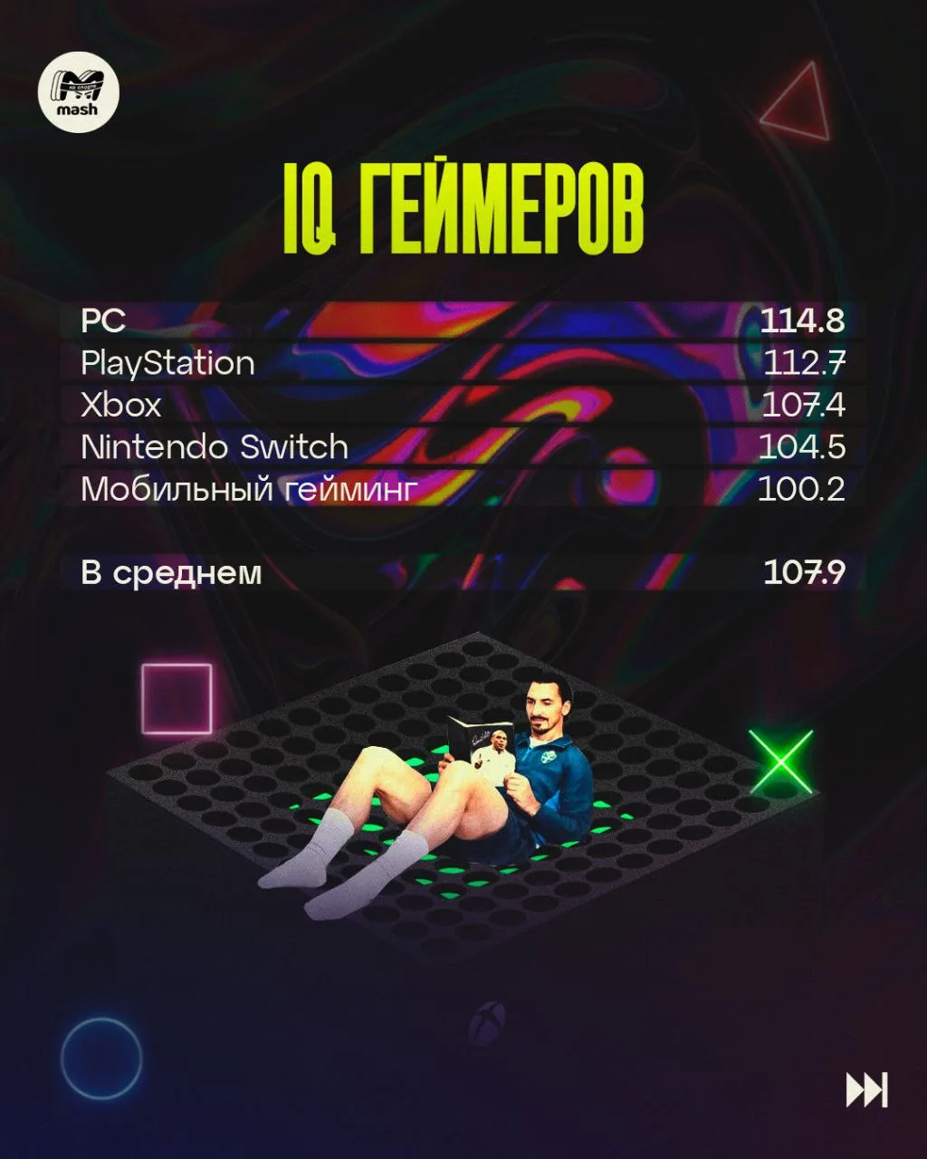 ПК-геймеры стали лидерами рейтинга IQ в зависимости от игровой платформы со средним показателем 114,8. Игроки на PlayStation оказались умнее игроков на Xbox. Плойка заняла второе место со средним IQ 112,7. Игроки, предпочитающие играть на ходу на мобилах или планшетах, заняли последнее место со средним показателем 100,2.