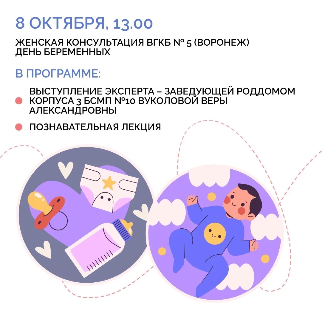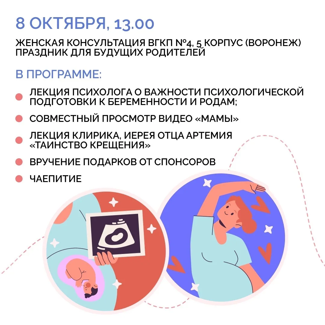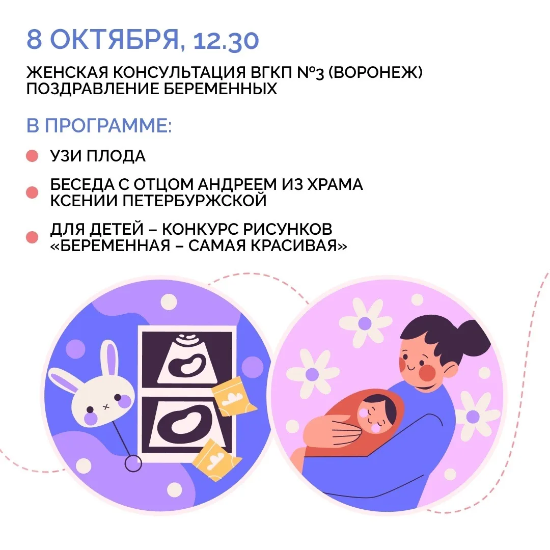 7 октября в России празднуют День беременных. В честь этого воронежские медицинские учреждения региона проведут ряд мероприятий, посвященных теме материнства, отцовства, семьи и поддержки беременных. Для будущих мам подготовили экскурсии, лекции психологов, круглые столы, вручение подарков. Подробнее — в наших карточках.