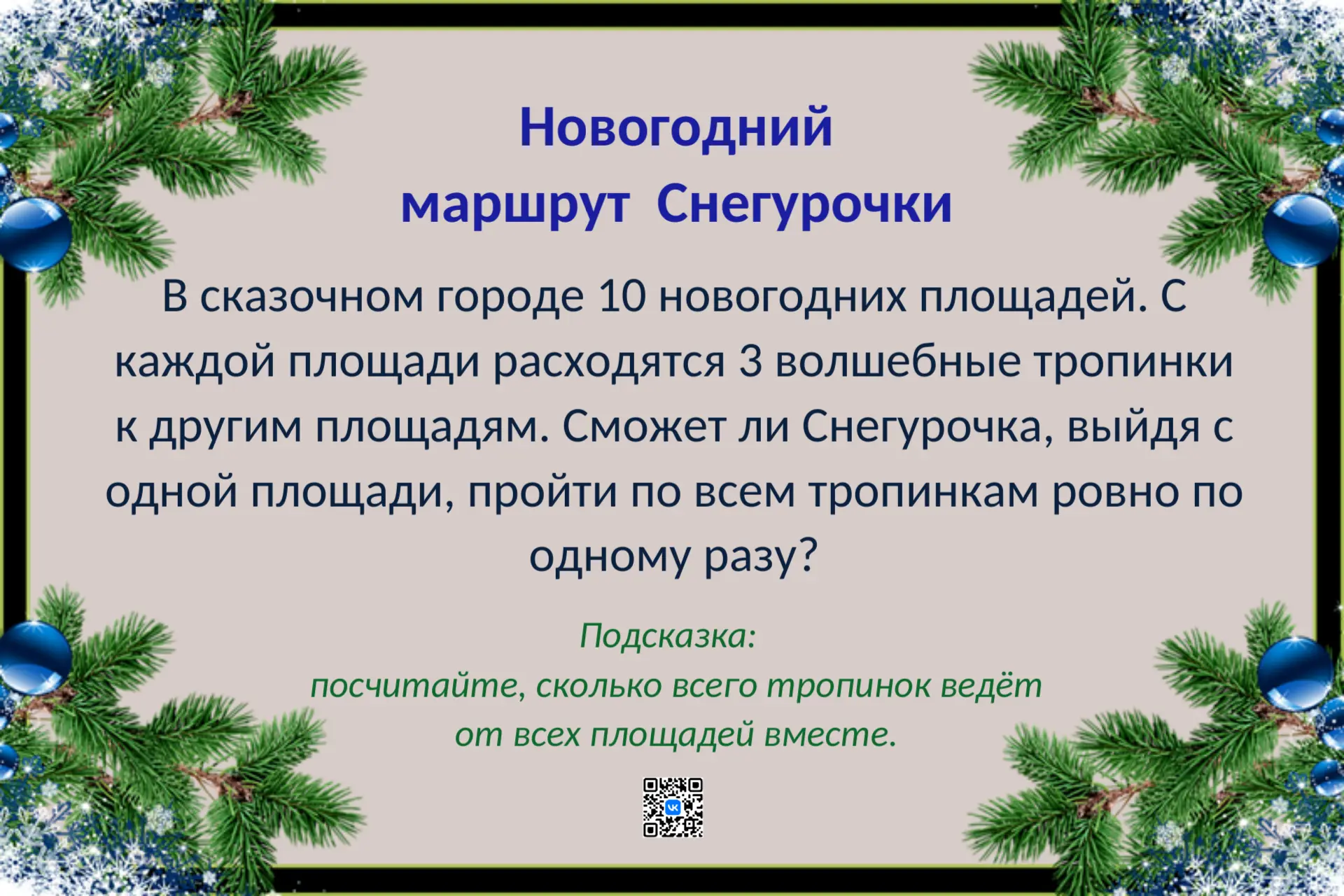 🧭 Задача 3: Новогодний маршрут Снегурочки В городе 10 площадей, от каждой идёт 3 тропинки. Можно ли пройти по всем тропинкам ровно один раз?