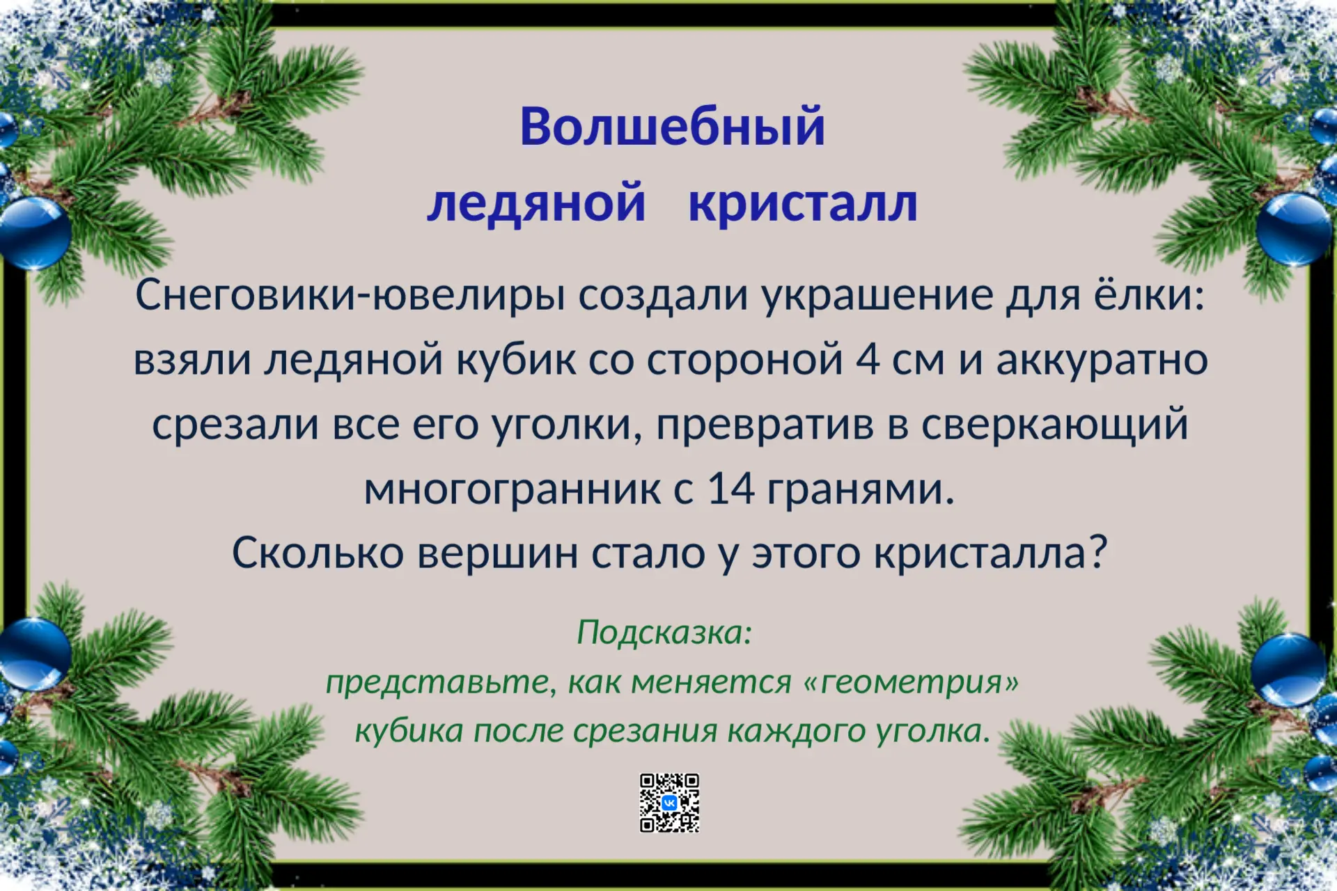 ❄️ Задача 1: Волшебный ледяной кристалл Снеговики взяли кубик льда (4 см) и срезали все углы — получился многогранник с 14 гранями. Сколько у него вершин?
