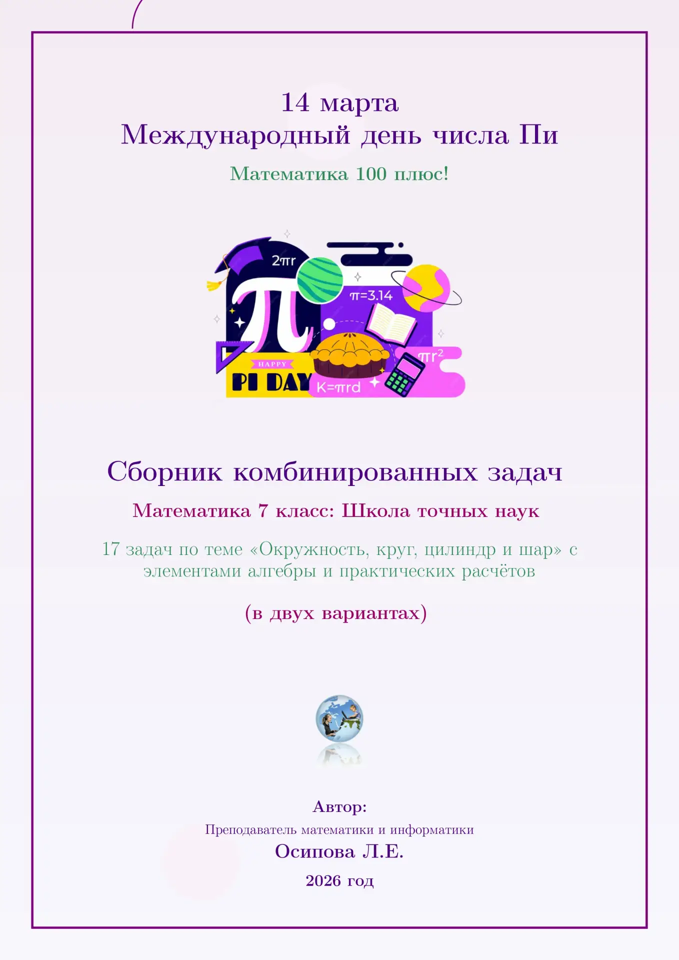 Готов ещё один подарок! 🎁 Мы подготовили для вас сборник задач по математике для 7 класса, посвящённый этому удивительному числу. В нём вы найдёте: 17 комбинированных задач в двух вариантах по темам «Окружность, круг, цилиндр и шар». Это не просто вычисления, а настоящие сюжеты: космические орбиты, гоночные трассы, золотые монеты, архитектурные загадки и исторические факты о числе π.