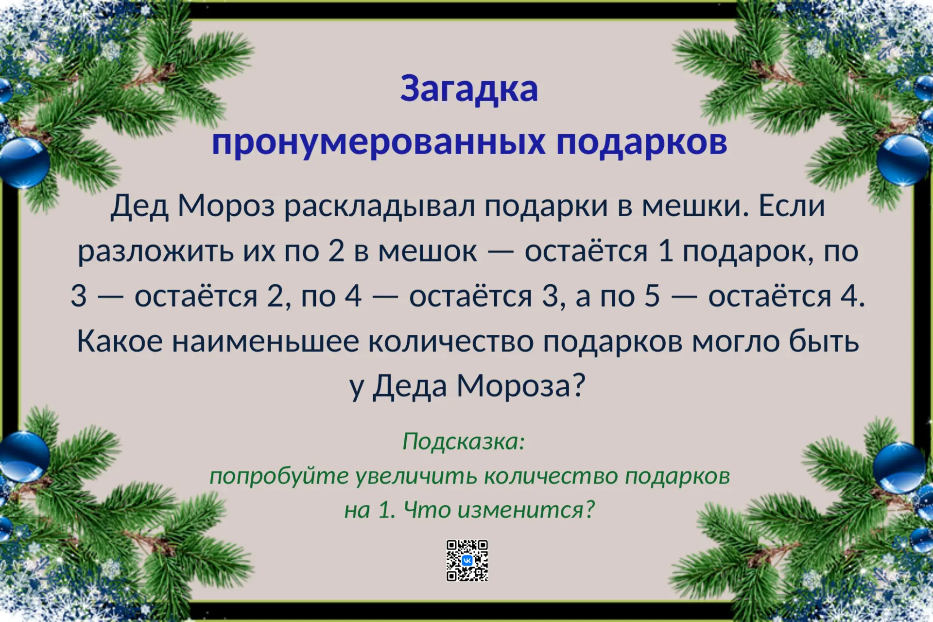 🎁 Задача 2: Загадка пронумерованных подарков Если разложить подарки по 2, 3, 4, 5 в мешок — остаётся 1, 2, 3, 4 подарка соответственно. Сколько всего подарков?