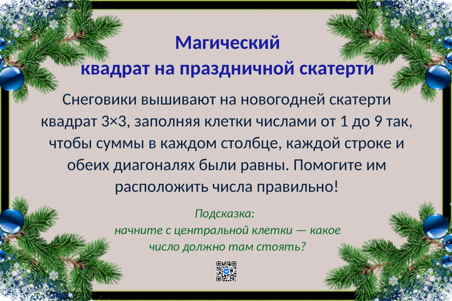🧩 Задача 4: Магический квадрат на праздничной скатерти Расставьте числа от 1 до 9 в квадрате 3×3 так, чтобы суммы в строках, столбцах и диагоналях были равны.