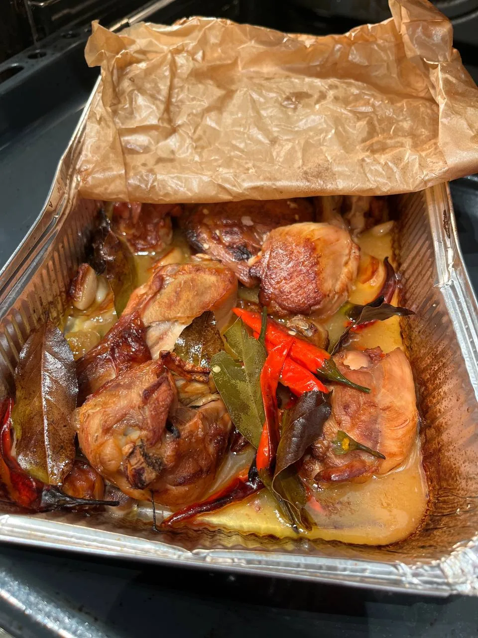 Куски курицы надо посолить и обжарить на оливковом масле. Потом добавить в сковородку лаврушку, уксус, воду/бульон, чеснок (чистить не нужно), чили (перчики я накалываю острым ножом, чтобы они охотнее отдавали остроту). Несколько минут тушим и отправляем в духовку на 180 градусов и 45 минут. Сначала лучше прикрыть форму смятой мокрой бумагой для запекания, а под конец можно убрать её и включить вентилятор, чтобы курица поджарилась.