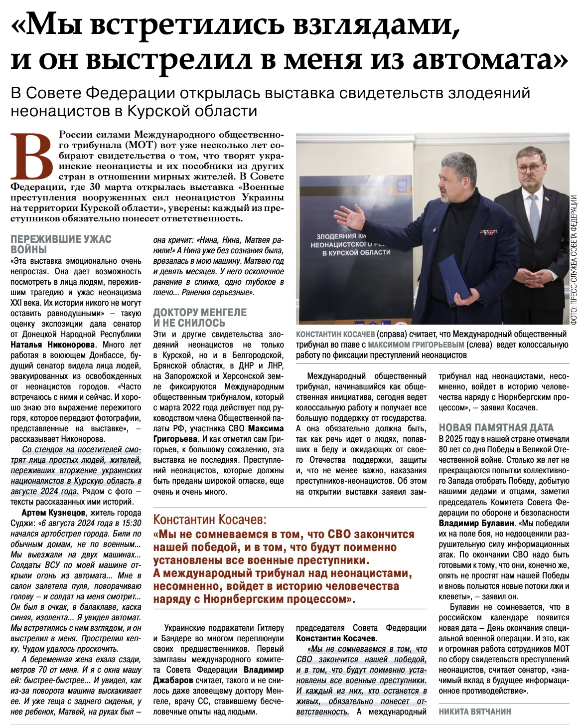 На презентации нашего доклада "Доктора Менгеле киевского режима" председатель Комиссии Совета Федерации по защите государственного суверенитета Российской Федерации, первый заместитель председателя Комитета Совета Федерации по международным делам Владимир Джабаров отметил: