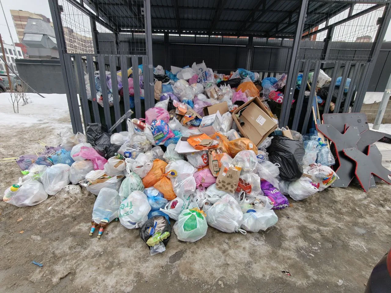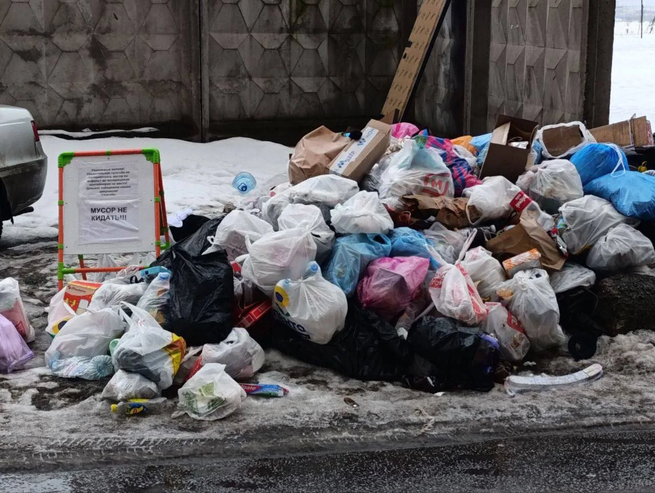 Управляющая компания специально установила яркий щит с просьбой не бросать мусор на асфальт до возвращения контейнера, но человеческая лень и наглость взяли верх, превратив тротуар в памятник безответственности.