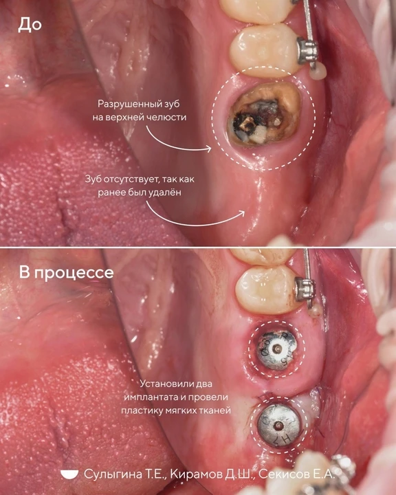 ▫️удалили разрушенный зуб, а затем установили два имплантата; в области отсутствующего зуба провели пластику мягких тканей