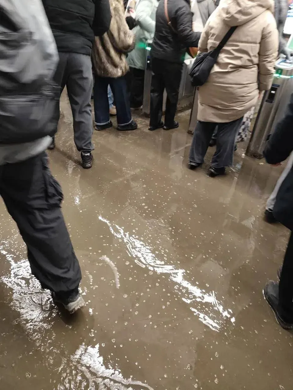 Утро у пассажиров на станции метро «Девяткино» начинается не с кофе, а с мессива цвета какао под ногами.