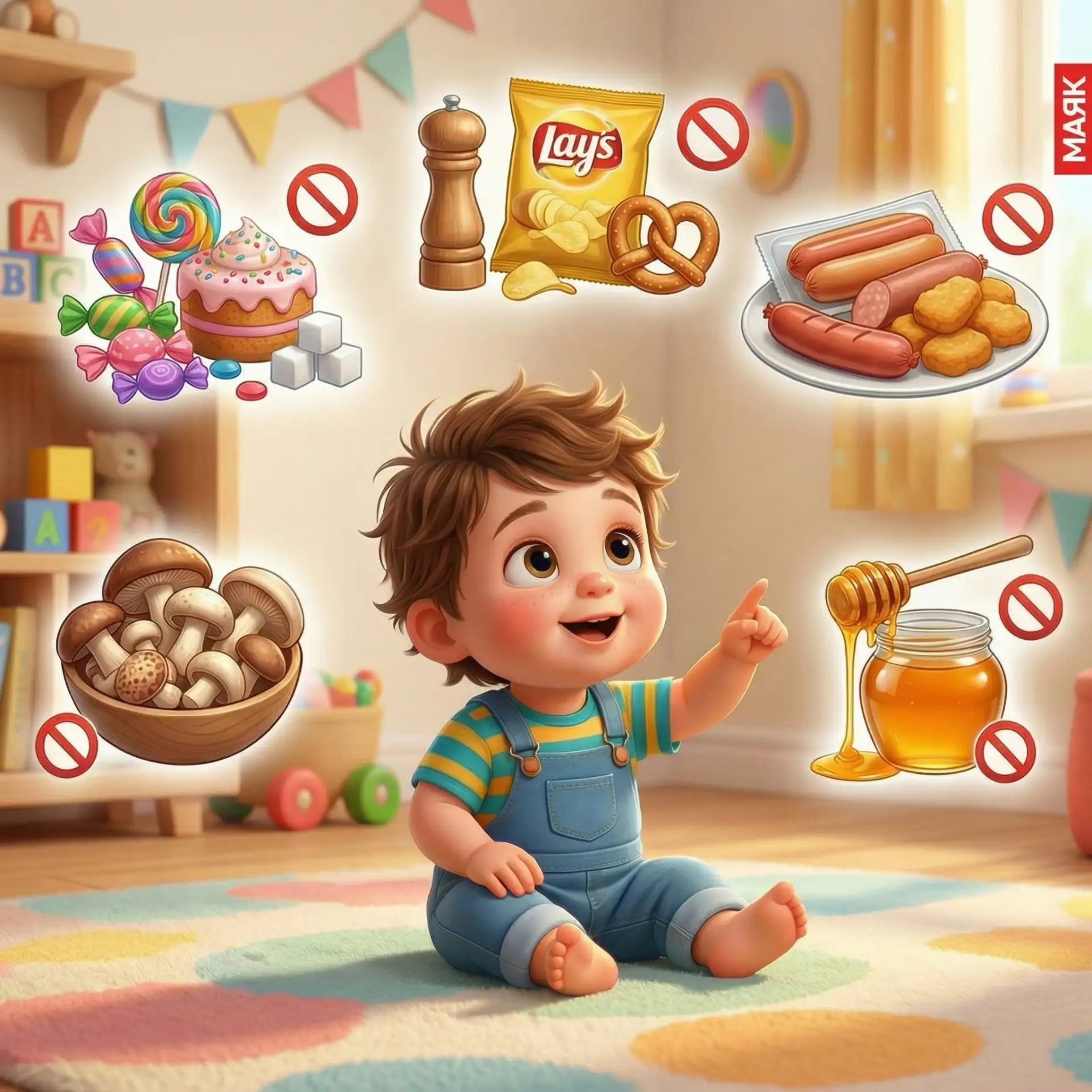 👶 После года в рацион ребёнка постепенно добавляются овощи, мясо, рыба, яйца и кисломолочные продукты. При этом важно избегать жареного, копченого, грибов, шоколада, цельного молока.