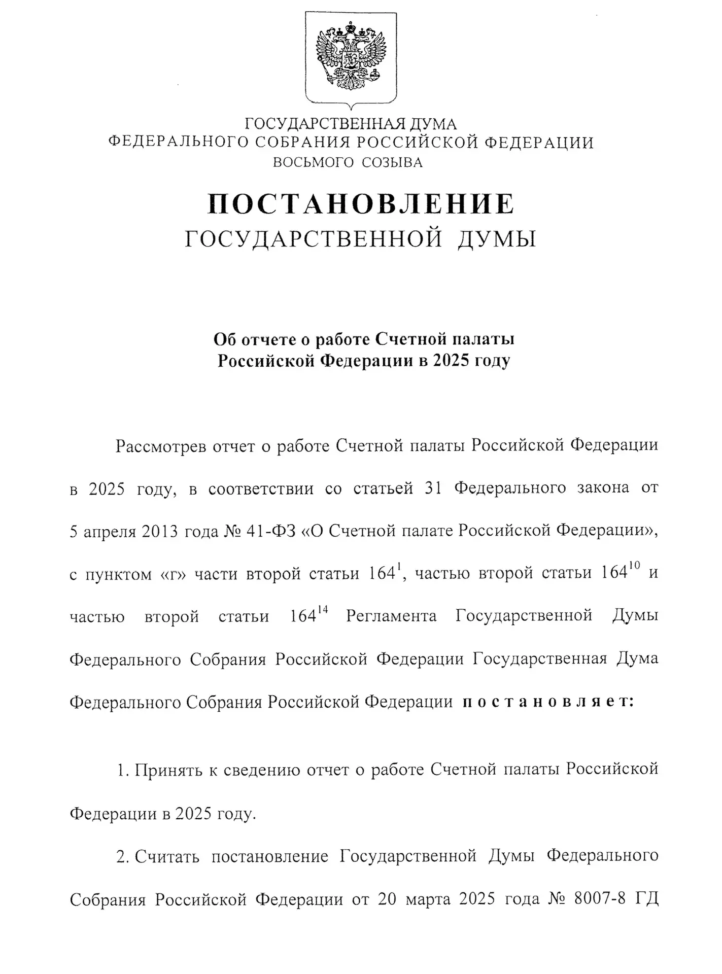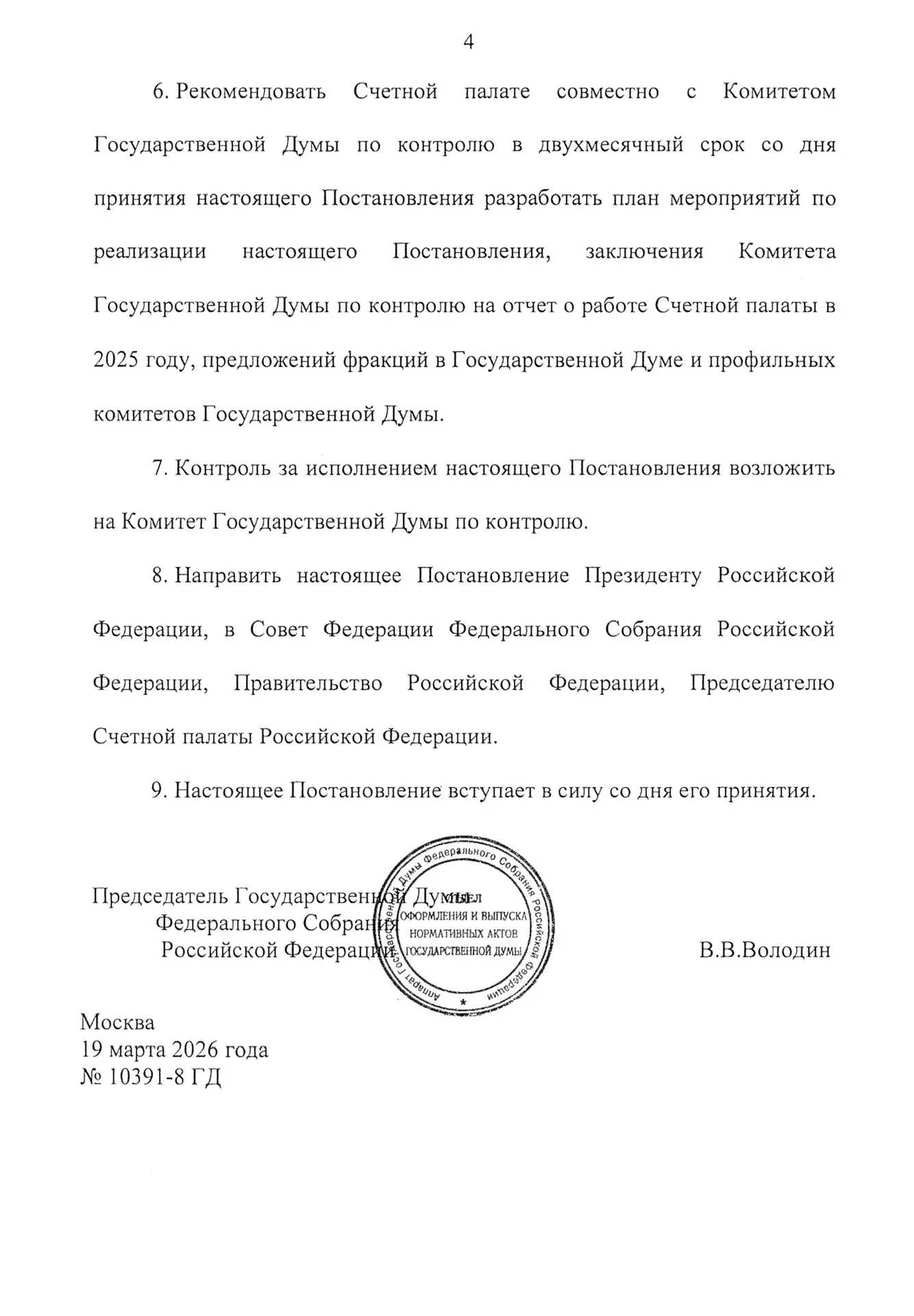 Национальные проекты закреплены как центральный объект контроля: спикер Госдумы Вячеслав Володин в постановлении по отчёту за 2025 год председателя Счётной палаты Бориса Ковальчука прямо указывает на необходимость постоянного мониторинга их реализации наряду с государственными программами.