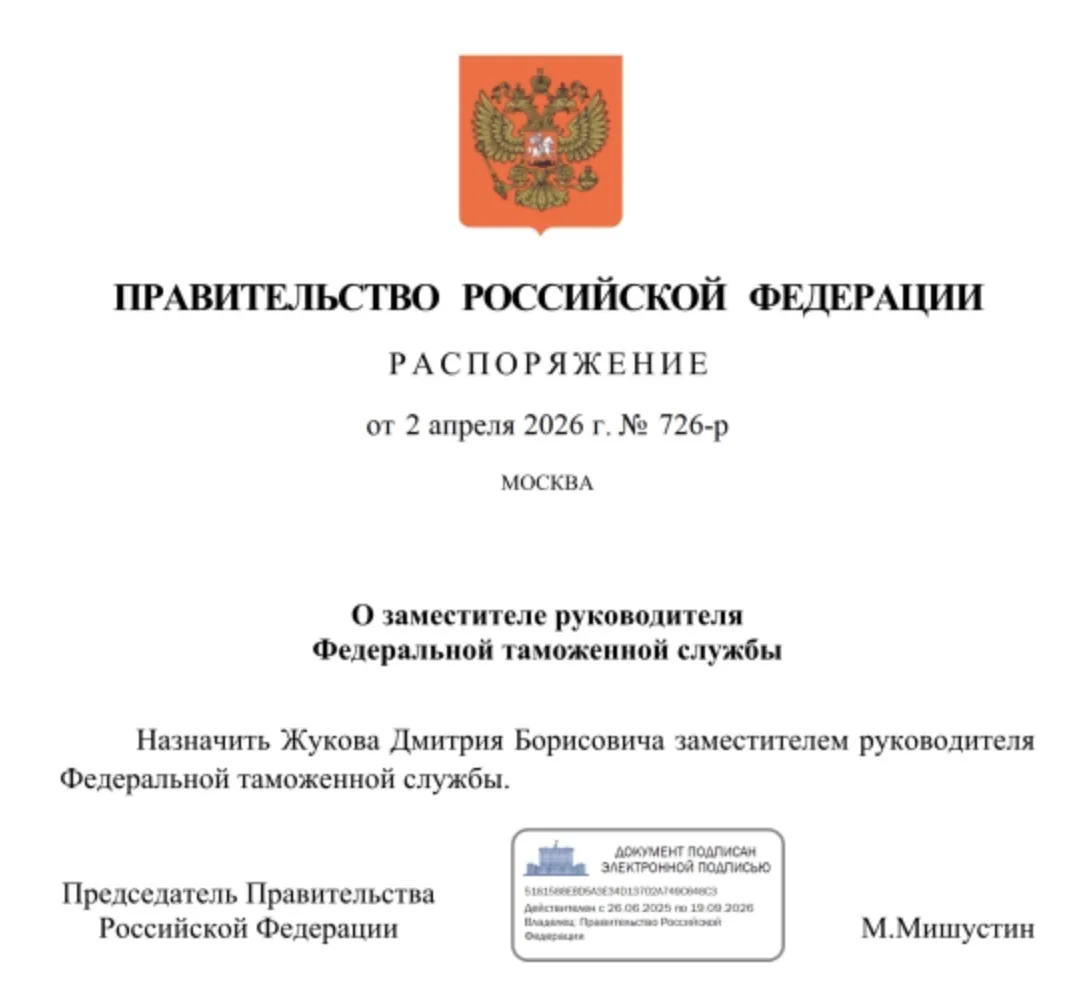 💼 Заместителем руководителя Федеральной таможенной службы назначен Дмитрий Жуков. В последние полтора года он возглавлял Дальневосточное таможенное управление, а до этого — десять лет трудился начальником Главного управления организации таможенного оформления и таможенного контроля ФТС России.