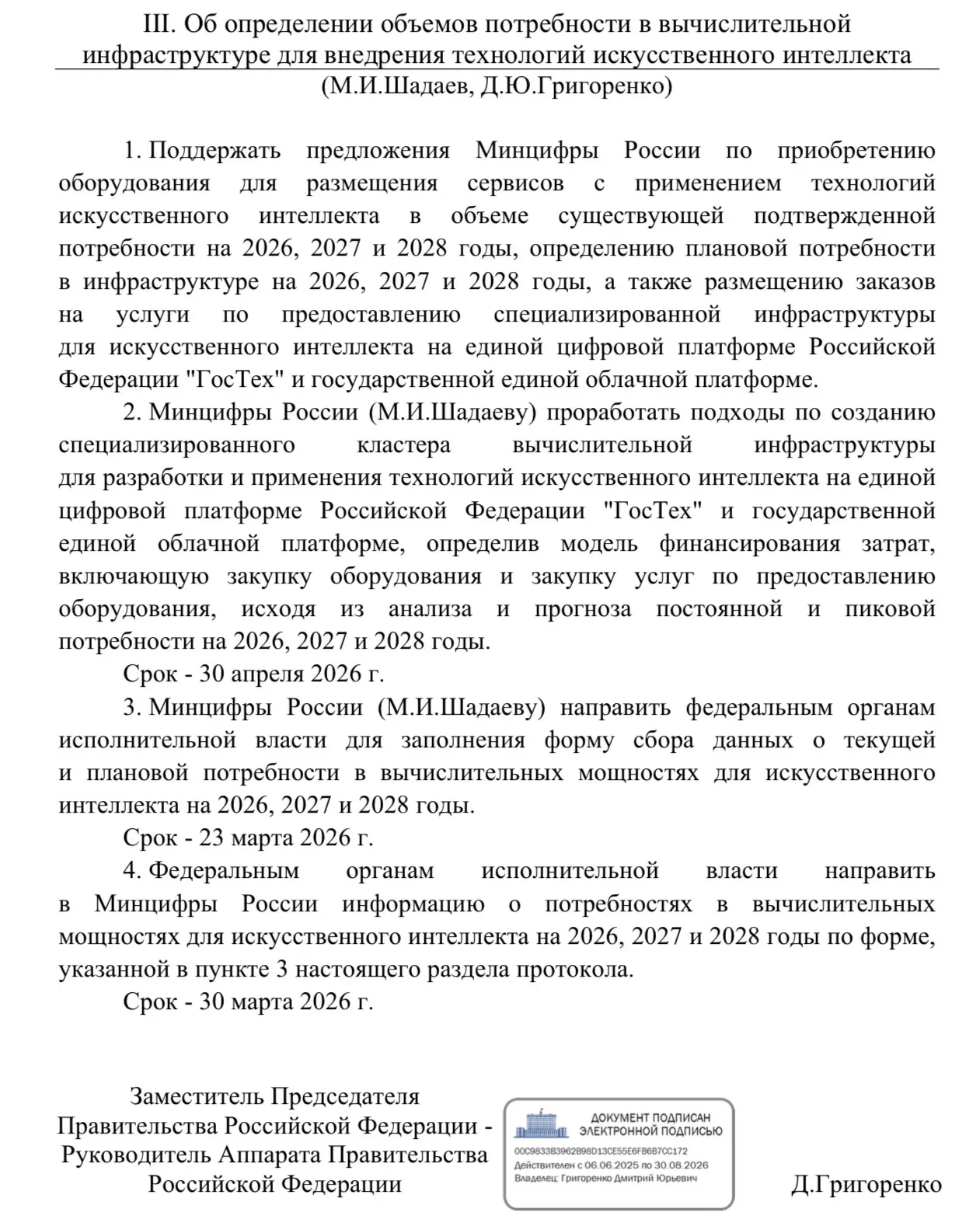 Министерствам и ведомствам предписано представить не описания проектов, а цифры: где уже используется ИИ и какой эффект это даёт. Параллельно каждый орган власти должен определить объём текущей и прогнозной нагрузки — чтобы на этой основе можно было впервые собрать единый государственный запрос на вычислительную инфраструктуру.