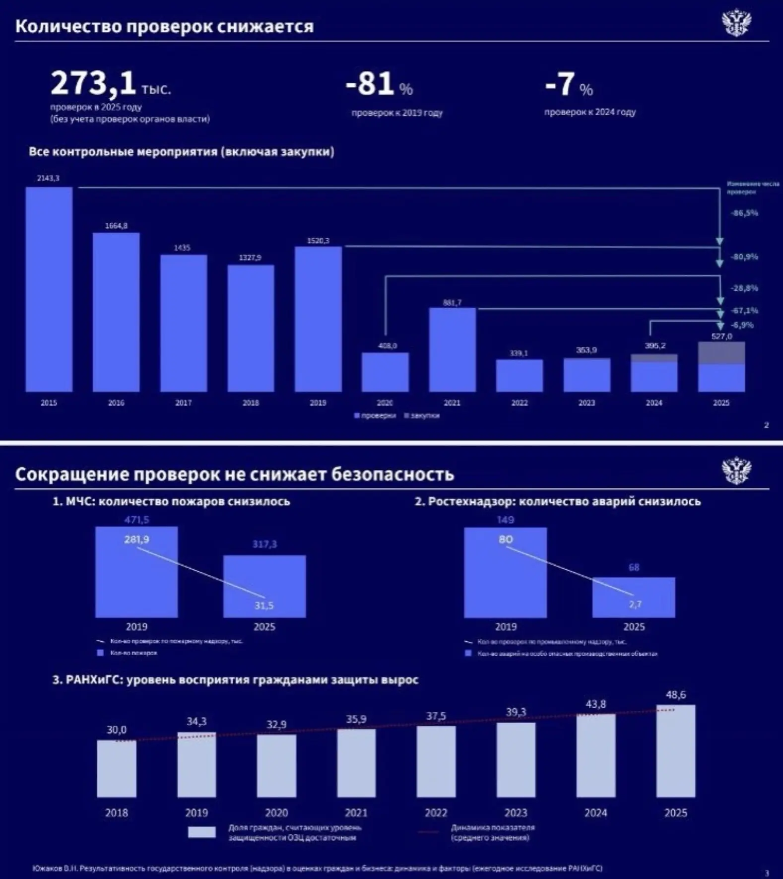 При этом сокращение проверок не снижает уровень безопасности. Например, количество проверок в сфере промышленного надзора сократилось кратно (в 2019 — 80 тысяч проверок, а в 2025 — 2,7 тысяч проверок). За это время также кратно сократилось количество аварий на особо опасных производственных объектах (со 149 до 68). Данные – из презентации Минэкономразвития.