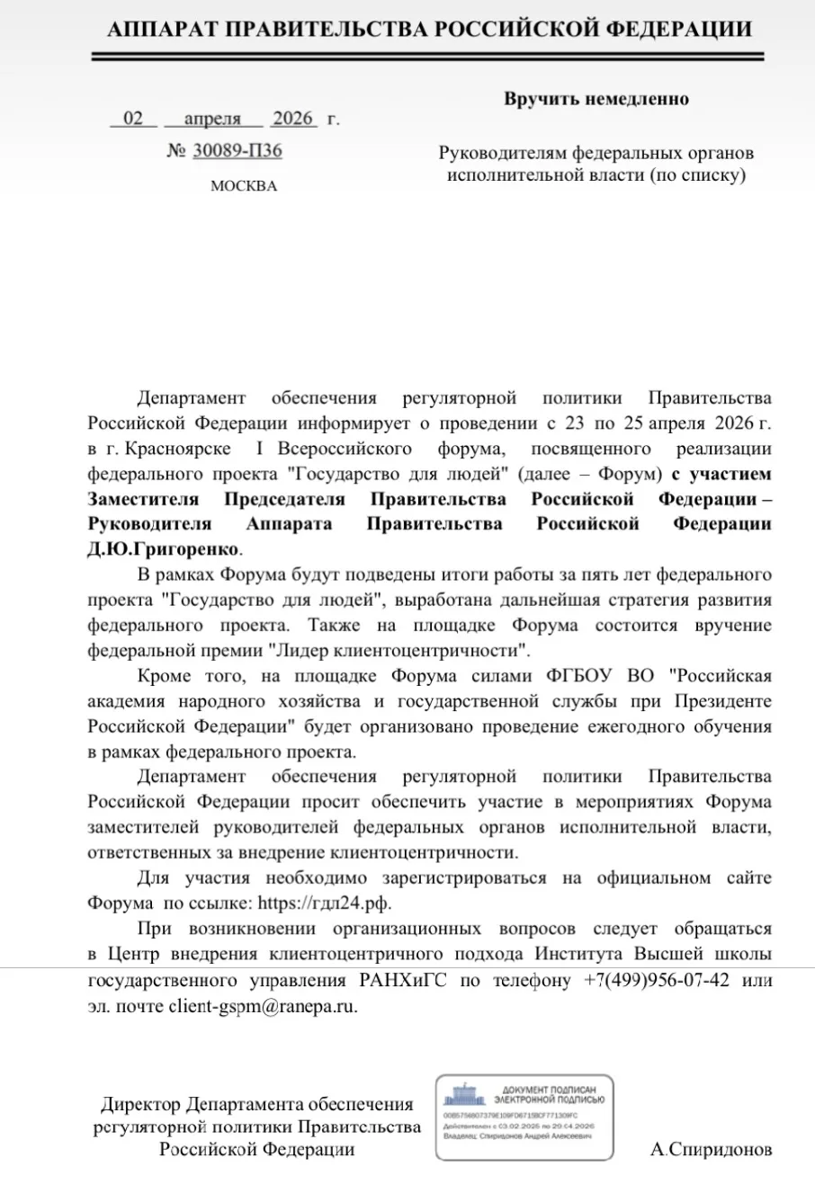 Директор департамента обеспечения регуляторной политики Правительства России Андрей Спиридонов широко разослал в федеральные органы государственной власти письмо насчёт первого Всероссийского форума, посвященного реализации федерального проекта «Государство для людей», который пройдёт 23–25 апреля в Красноярске.