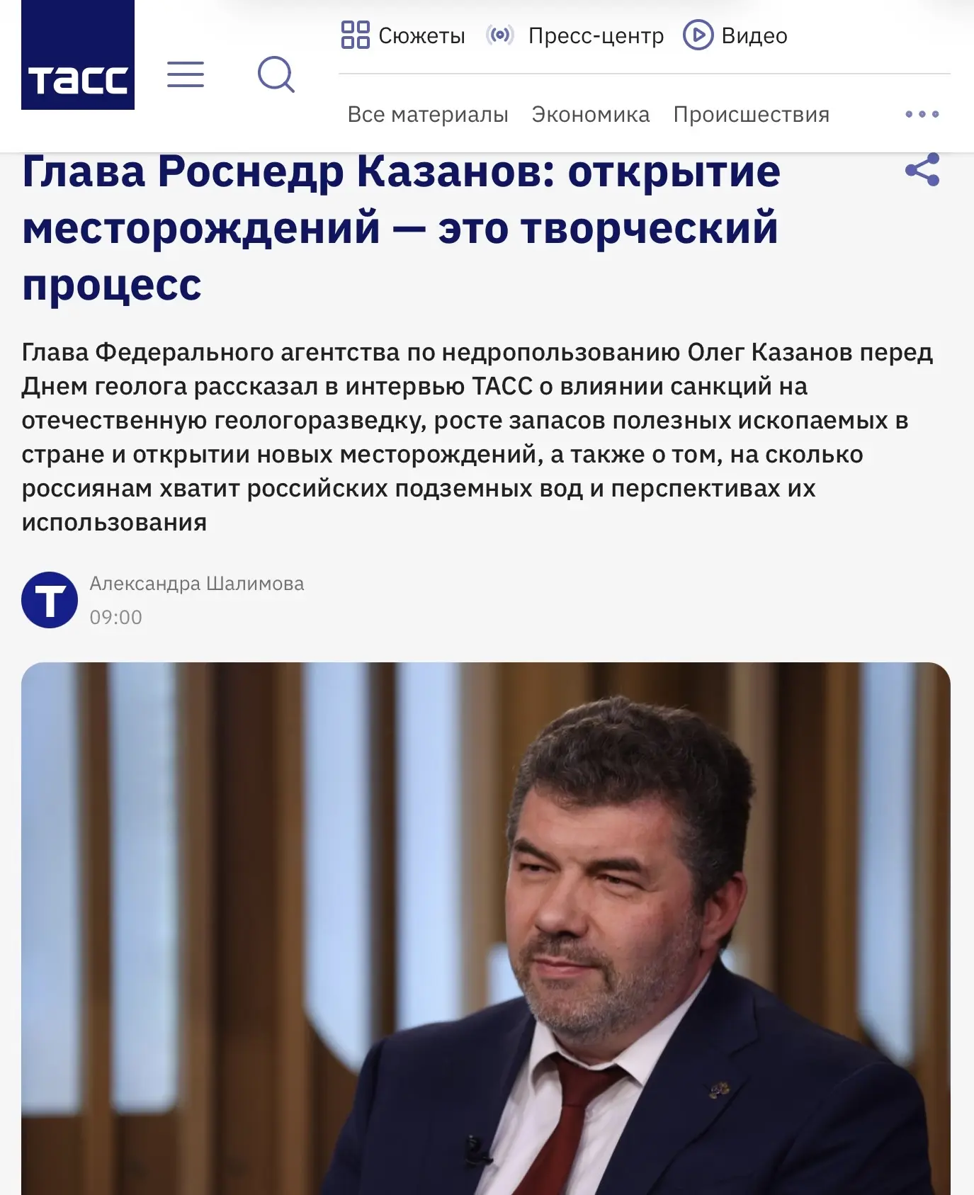 Руководитель Федерального агентства по недропользованию Олег Казанов — в интервью агентству ТАСС: