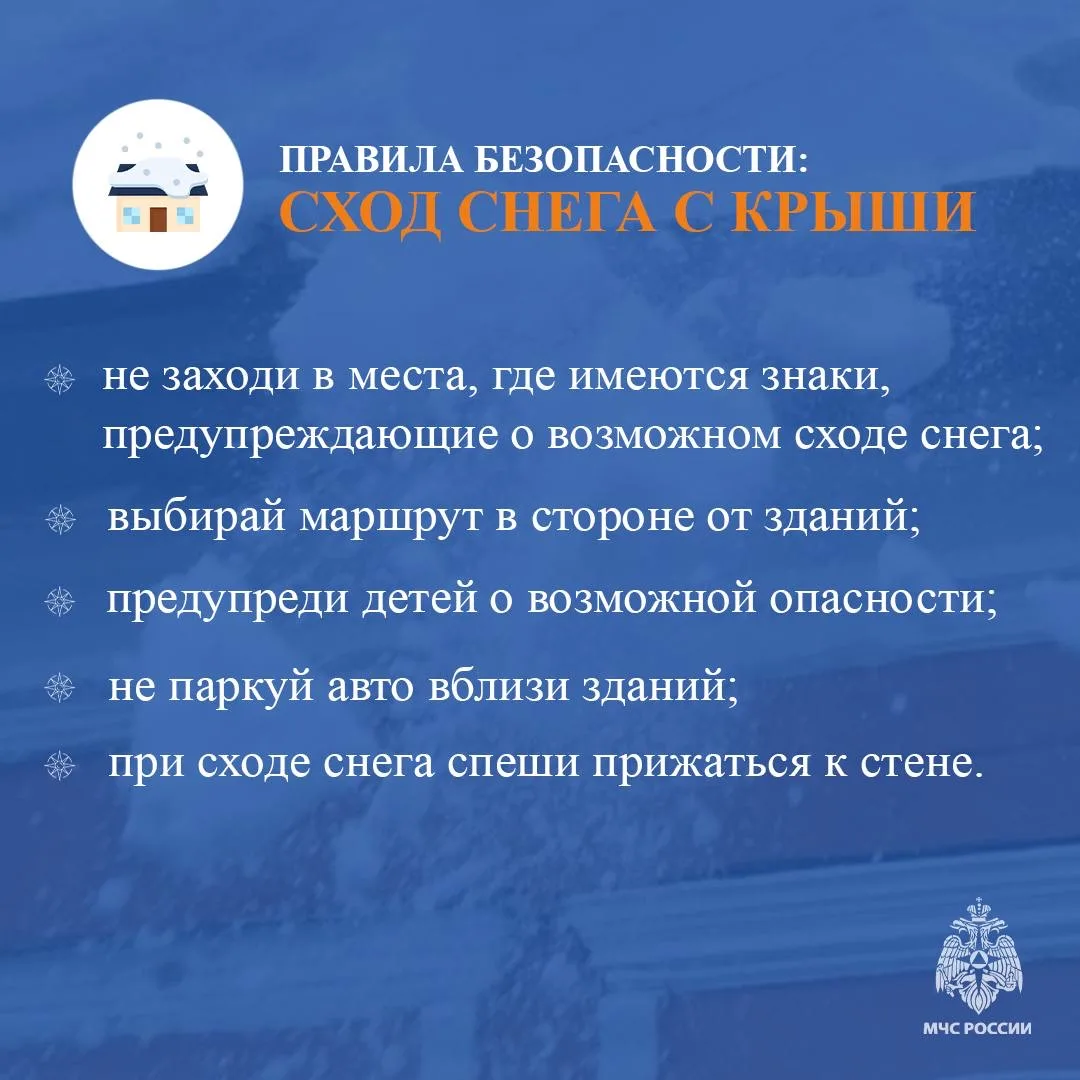 Будь внимателен: снег сходит за считанные секунды - не предугадаешь. Соблюдай правила безопасности от МЧС России, подробнее в нашей памятке.