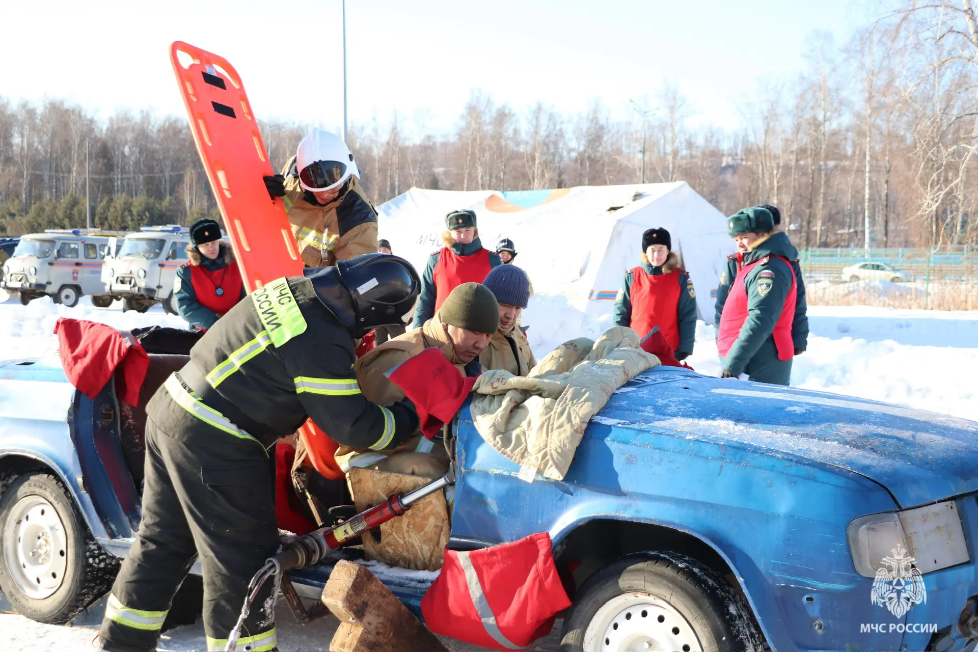 Каждая команда на время выполняла задание, согласно которому в результате крупного ДТП в автомобилях есть пострадавшие, их необходимо извлечь и передать бригаде скорой медицинской помощи.