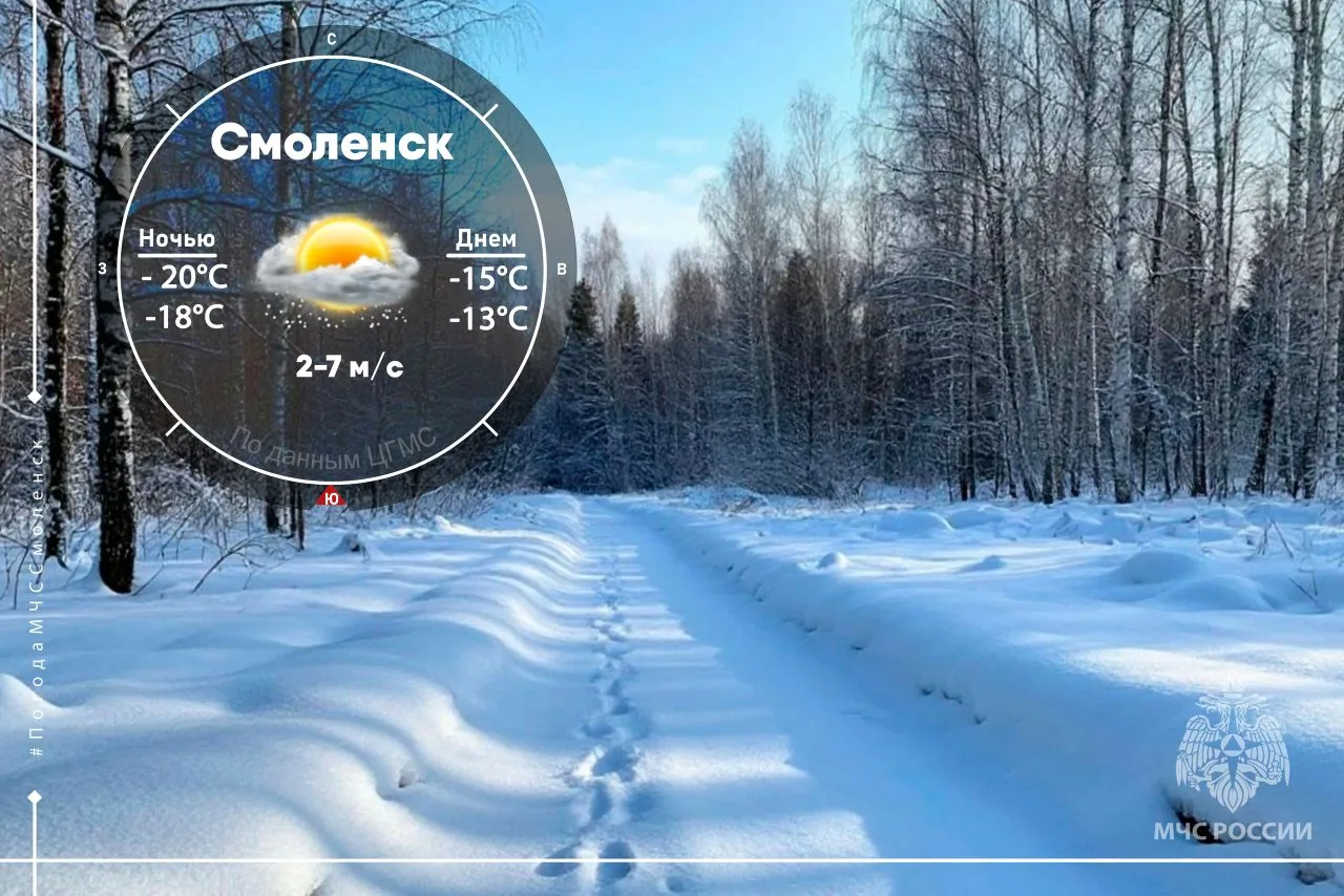 Что касается температуры, то ночью столбик термометра опустится до –21…–16°C, а в отдельных районах при прояснениях возможен пик холода до –26°C. Днём воздух прогреется не сильно – –16…–11°C по области, в Смоленске будет чуть теплее: –20…–18°C ночью, и –15…–13°C днём.